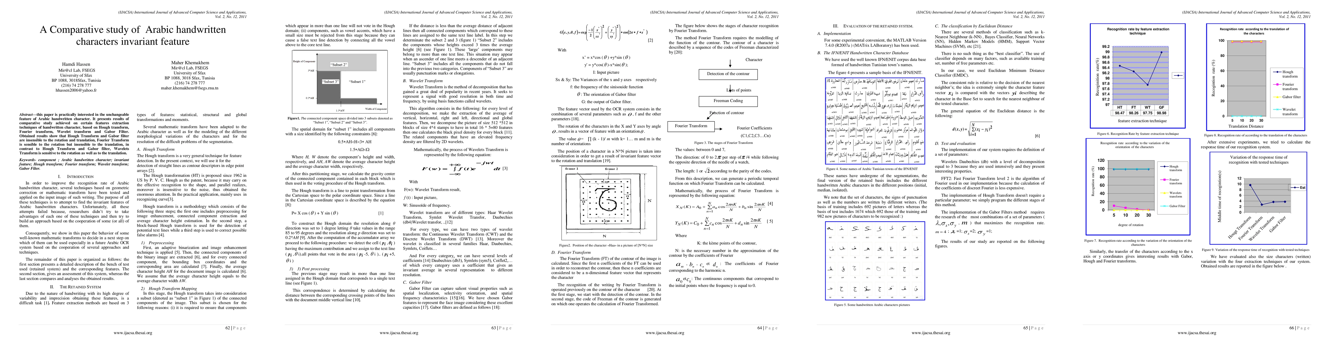 This paper compares four feature extraction techniques (Hough Transform, Fourier Transform, Wavelet Transform, and Gabor Filter) for invariant analysis of Arabic handwritten characters, finding that Hough and Gabor filters perform well against rotation and translation, while Fourier and Wavelet transforms are sensitive to these variations.