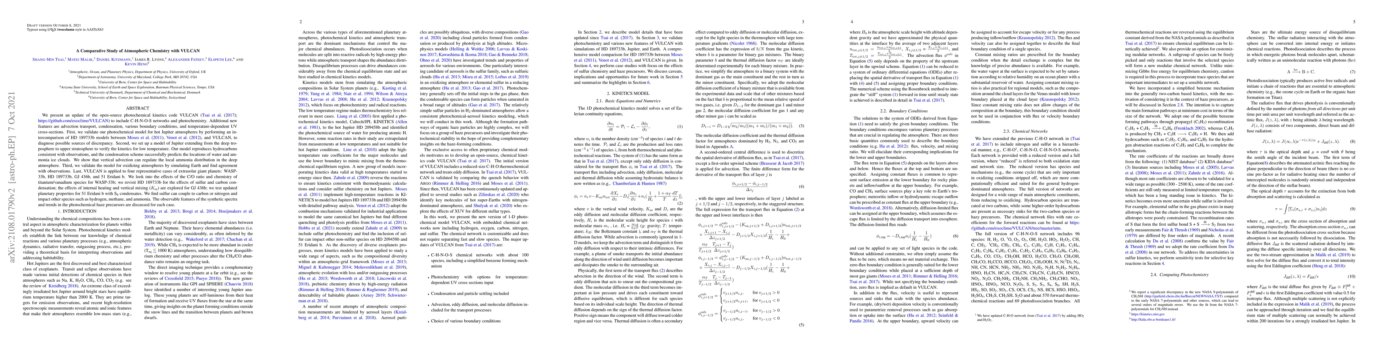 We present an update of the open-source photochemical kinetics code VULCAN (Tsai et al. 2017; https://github.com/exoclime/VULCAN) to include C-H-N-O-S networks and photochemistry. Additional new features are advection transport, condensation, various boundary conditions, and temperature-dependent UV cross-sections. First, we validate our photochemical model for hot Jupiter atmospheres by performing an intercomparison of HD 189733b models between Moses et al. (2011), Venot et al. (2012), and VULCAN, to diagnose possible sources of discrepancy. Second, we set up a model of Jupiter extending from the deep troposphere to upper stratosphere to verify the kinetics for low temperature. Our model reproduces hydrocarbons consistent with observations, and the condensation scheme successfully predicts the locations of water and ammonia ice clouds. We show that vertical advection can regulate the local ammonia distribution in the deep atmosphere. Third, we validate the model for oxidizing atmospheres by simulating Earth and find agreement with observations. Last, VULCAN is applied to four representative cases of extrasolar giant planets: WASP-33b, HD 189733b, GJ 436b, and 51 Eridani b. We look into the effects of the C/O ratio and chemistry of titanium/vanadium species for WASP-33b; we revisit HD 189733b for the effects of sulfur and carbon condensation; the effects of internal heating and vertical mixing ($K_{\textrm{zz}}$) are explored for GJ 436b; we test updated planetary properties for 51 Eridani b with S$_8$ condensates. We find sulfur can couple to carbon or nitrogen and impact other species such as hydrogen, methane, and ammonia. The observable features of the synthetic spectra and trends in the photochemical haze precursors are discussed for each case.
