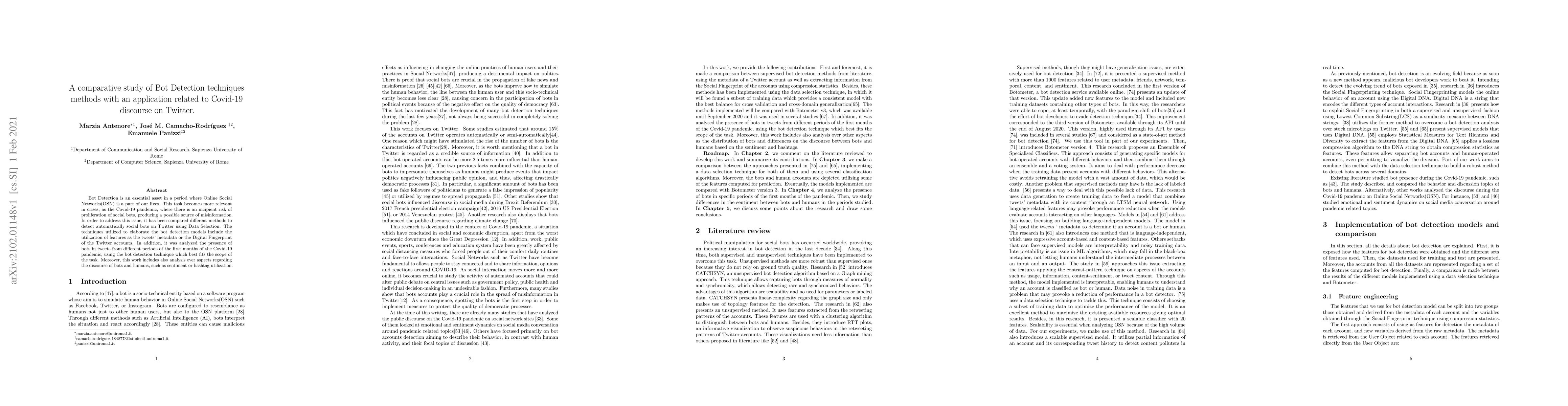 Bot Detection is an essential asset in a period where Online Social Networks(OSN) is a part of our lives. This task becomes more relevant in crises, as the Covid-19 pandemic, where there is an incipient risk of proliferation of social bots, producing a possible source of misinformation. In order to address this issue, it has been compared different methods to detect automatically social bots on Twitter using Data Selection. The techniques utilized to elaborate the bot detection models include the utilization of features as the tweets metadata or the Digital Fingerprint of the Twitter accounts. In addition, it was analyzed the presence of bots in tweets from different periods of the first months of the Covid-19 pandemic, using the bot detection technique which best fits the scope of the task. Moreover, this work includes also analysis over aspects regarding the discourse of bots and humans, such as sentiment or hashtag utilization.