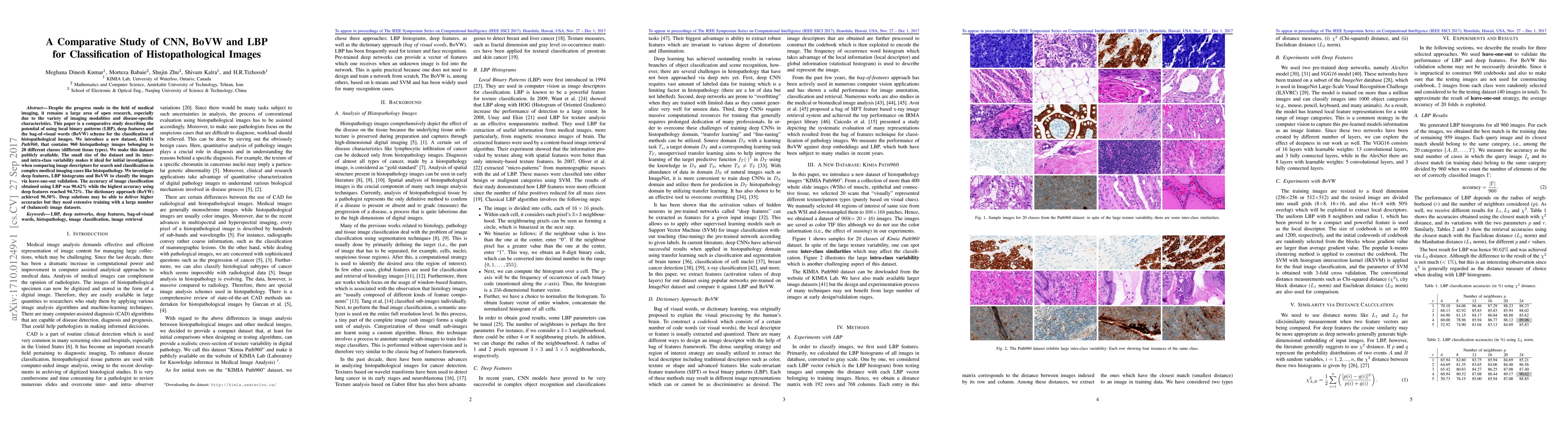 This paper compares the classification performance of LBP, CNN deep features, and BoVW on a new dataset, KIMIA Path960, containing 960 histopathology images. The study found that BoVW achieved the highest accuracy at 96.50%, while deep features reached 94.72%, and LBP obtained 90.62%.