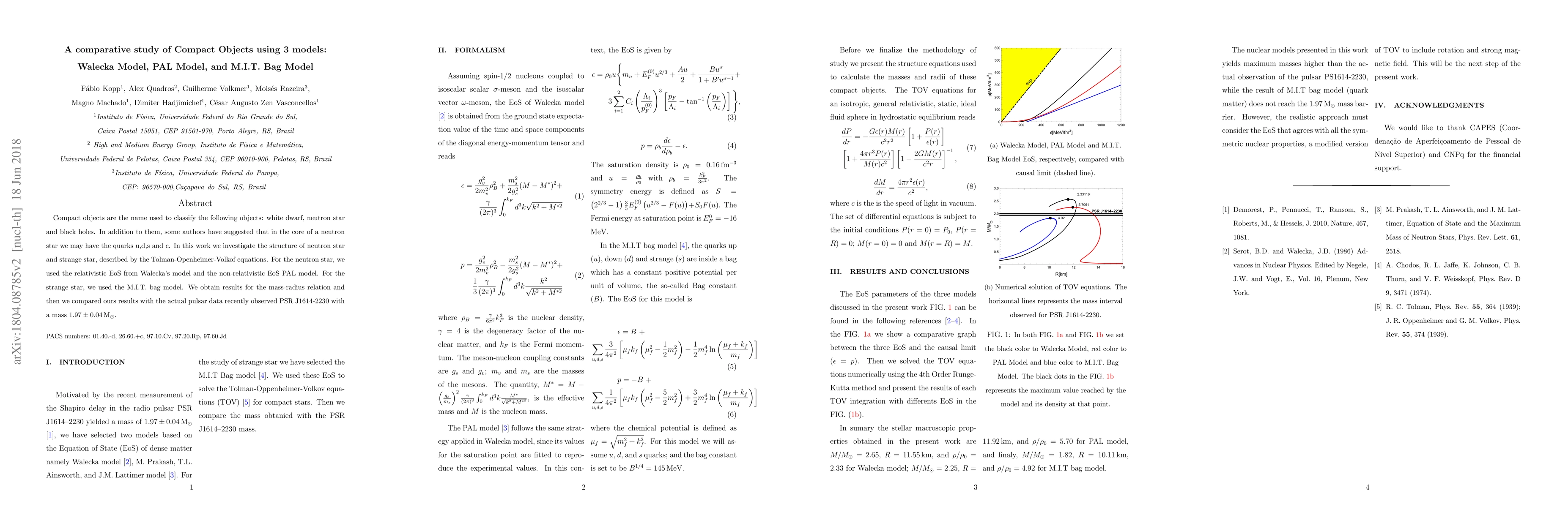 This study compares three models (Walecka, PAL, and M.I.T. Bag) to analyze neutron stars and strange stars. It derives mass-radius relations using TOV equations and compares these with data from PSR J1614-2230, a massive pulsar.