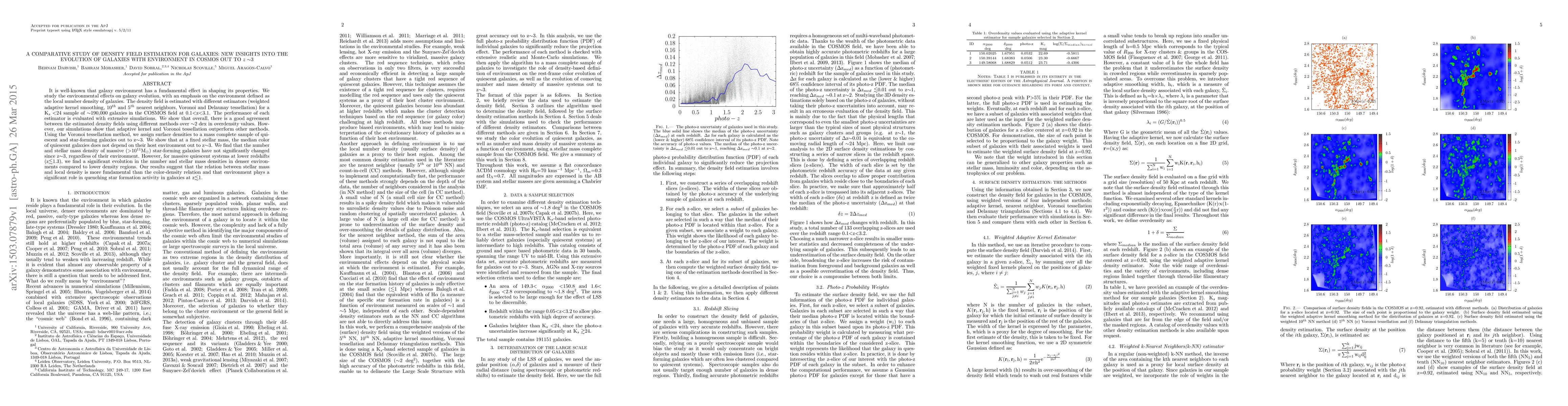 It is well-known that galaxy environment has a fundamental effect in shaping its properties. We study the environmental effects on galaxy evolution, with an emphasis on the environment defined as the local number density of galaxies. The density field is estimated with different estimators (weighted adaptive kernel smoothing, 10$^{th}$ and 5$^{th}$ nearest neighbors, Voronoi and Delaunay tessellation) for a K$_{s}<$24 sample of $\sim$190,000 galaxies in the COSMOS field at 0.1$<$z$<$3.1. The performance of each estimator is evaluated with extensive simulations. We show that overall, there is a good agreement between the estimated density fields using different methods over $\sim$2 dex in overdensity values. However, our simulations show that adaptive kernel and Voronoi tessellation outperform other methods. Using the Voronoi tessellation method, we assign surface densities to a mass complete sample of quiescent and star-forming galaxies out to z$\sim$3. We show that at a fixed stellar mass, the median color of quiescent galaxies does not depend on their host environment out to z$\sim$3. We find that the number and stellar mass density of massive ($>$10$^{11}$M$_{\odot}$) star-forming galaxies have not significantly changed since z$\sim$3, regardless of their environment. However, for massive quiescent systems at lower redshifts (z$\lesssim$1.3), we find a significant evolution in the number and stellar mass densities in denser environments compared to lower density regions. Our results suggest that the relation between stellar mass and local density is more fundamental than the color-density relation and that environment plays a significant role in quenching star formation activity in galaxies at z$\lesssim$1.