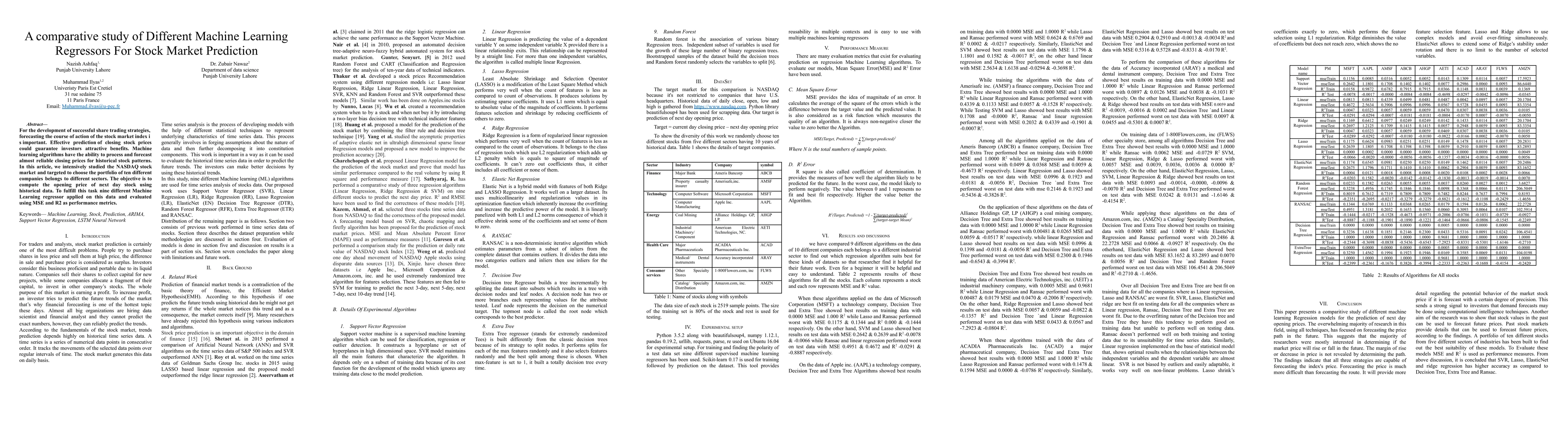 This paper compares nine machine learning regressors for predicting the next day's opening price of NASDAQ stocks based on historical data. The performance of these models is evaluated using MSE and R2 metrics to identify the most effective algorithm for stock market prediction.