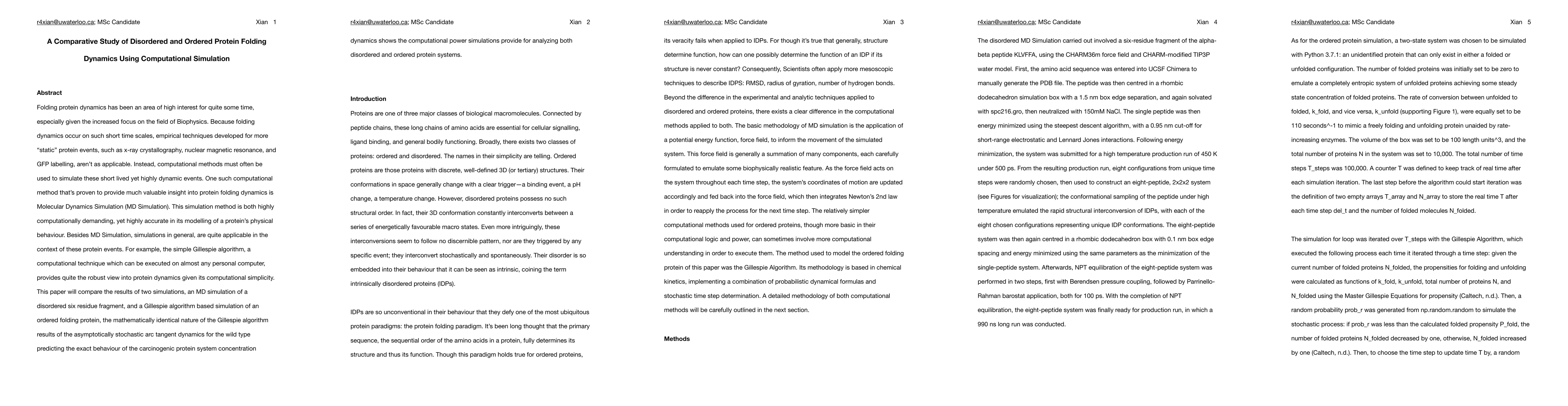 This paper compares the protein folding dynamics of a disordered six-residue carcinogenic protein using Molecular Dynamics Simulation and an ordered protein using the Gillespie algorithm, highlighting the computational power of simulations in analyzing protein folding.