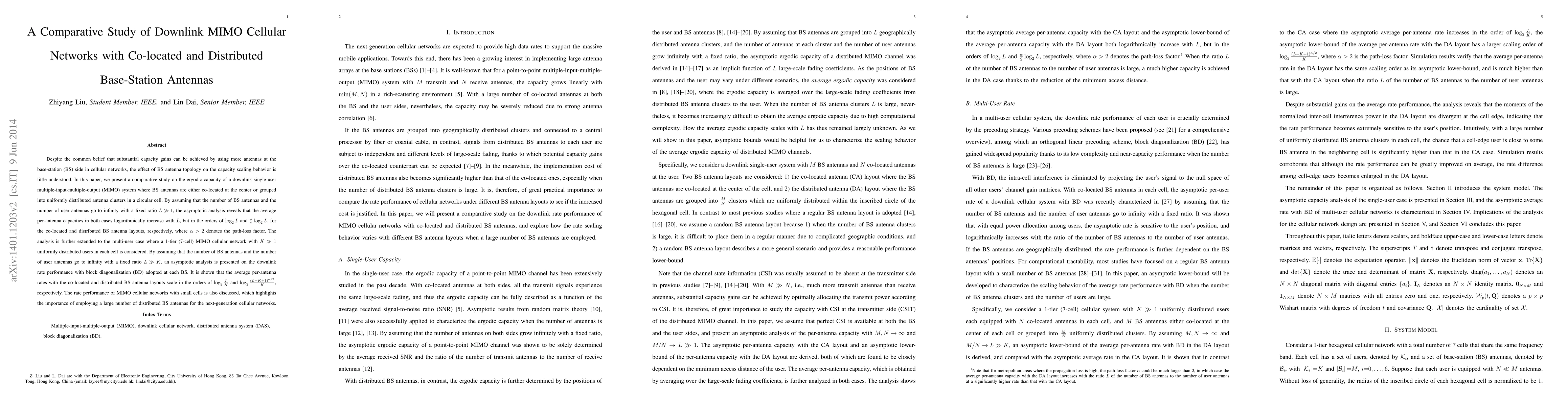 This paper compares the ergodic capacity of downlink MIMO cellular networks with co-located and distributed base-station antennas, revealing that both configurations achieve logarithmic capacity scaling with antenna count, but distributed antennas offer lower scaling rates due to path-loss factors. The study extends to multi-user scenarios, showing that distributed antennas are crucial for next-generation networks with many users.
