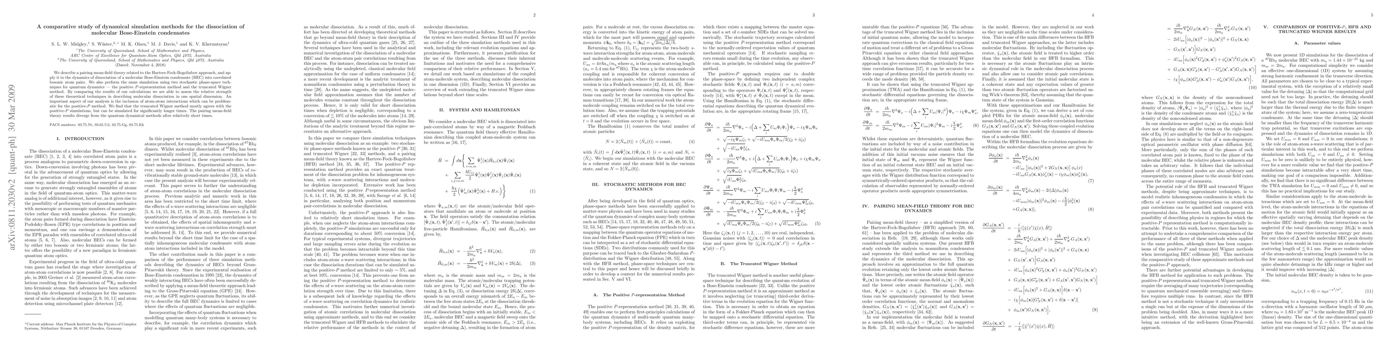 This paper compares the effectiveness of three dynamical simulation methods for modeling the dissociation of molecular Bose-Einstein condensates, finding that the truncated Wigner method provides longer-term agreement with the positive-P method, while the pairing mean-field theory diverges after short times.