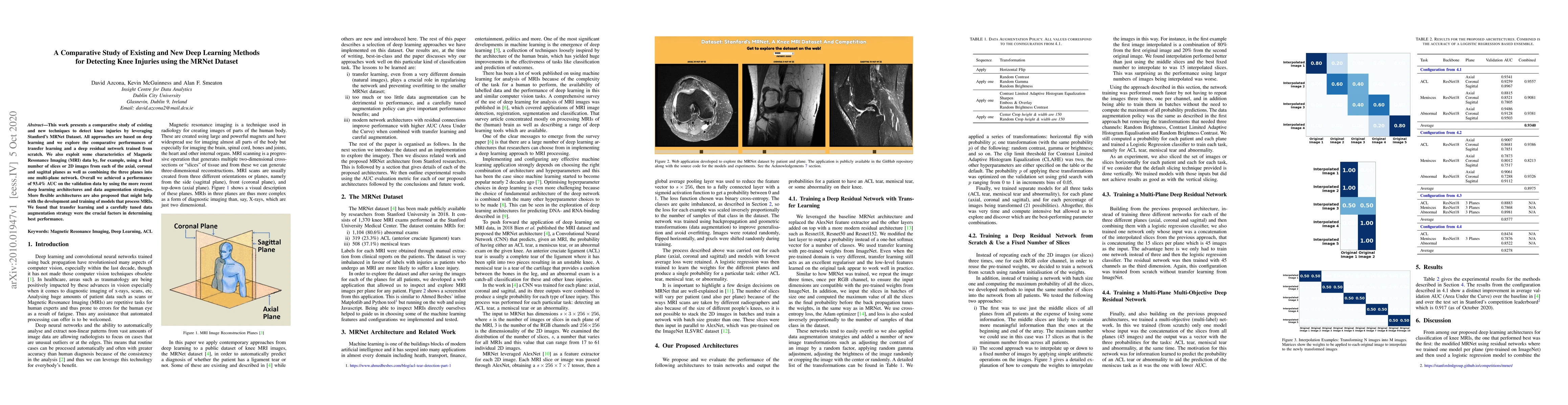 This work presents a comparative study of existing and new techniques to detect knee injuries by leveraging Stanford's MRNet Dataset. All approaches are based on deep learning and we explore the comparative performances of transfer learning and a deep residual network trained from scratch. We also exploit some characteristics of Magnetic Resonance Imaging (MRI) data by, for example, using a fixed number of slices or 2D images from each of the axial, coronal and sagittal planes as well as combining the three planes into one multi-plane network. Overall we achieved a performance of 93.4% AUC on the validation data by using the more recent deep learning architectures and data augmentation strategies. More flexible architectures are also proposed that might help with the development and training of models that process MRIs. We found that transfer learning and a carefully tuned data augmentation strategy were the crucial factors in determining best performance.