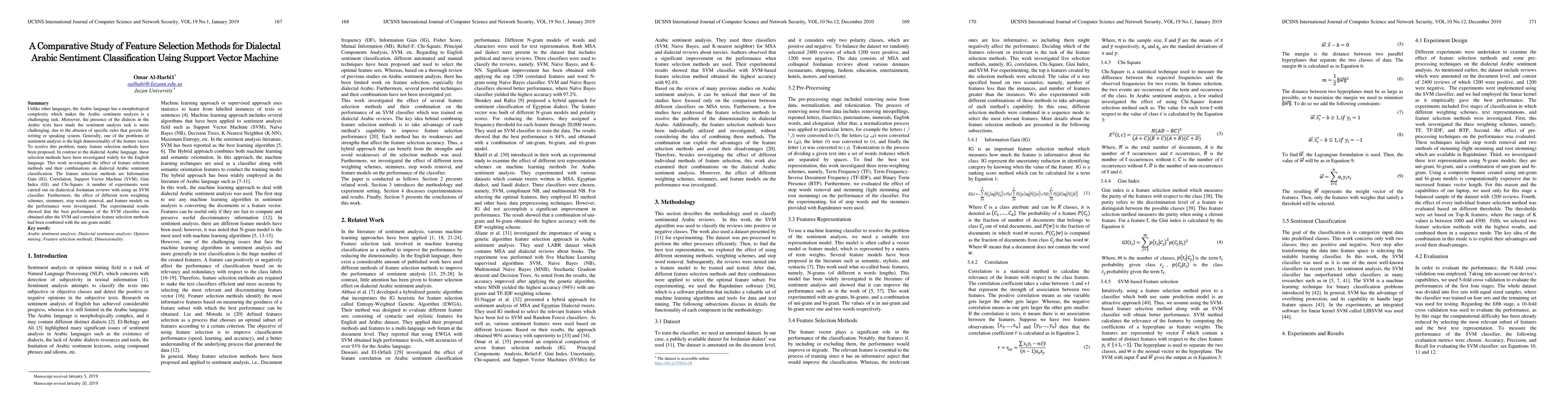 This study compares the effectiveness of various feature selection methods for classifying sentiment in dialectal Arabic using an SVM classifier. Experiments on Jordanian dialect reviews found that combining SVM and correlation-based feature selection with a uni-gram model yielded the best performance.