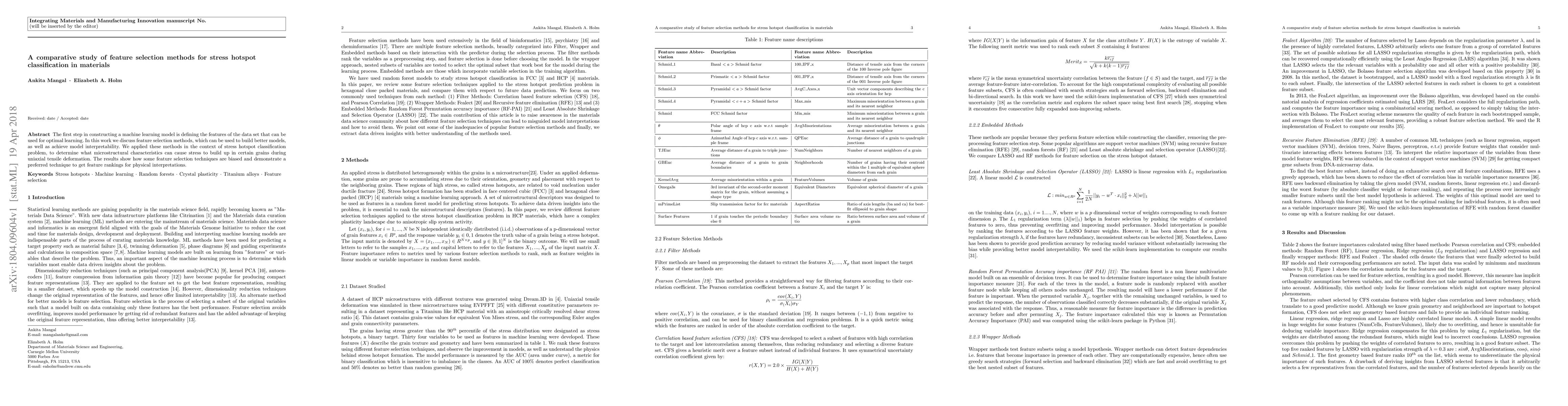 The first step in constructing a machine learning model is defining the features of the data set that can be used for optimal learning. In this work we discuss feature selection methods, which can be used to build better models, as well as achieve model interpretability. We applied these methods in the context of stress hotspot classification problem, to determine what microstructural characteristics can cause stress to build up in certain grains during uniaxial tensile deformation. The results show how some feature selection techniques are biased and demonstrate a preferred technique to get feature rankings for physical interpretations.