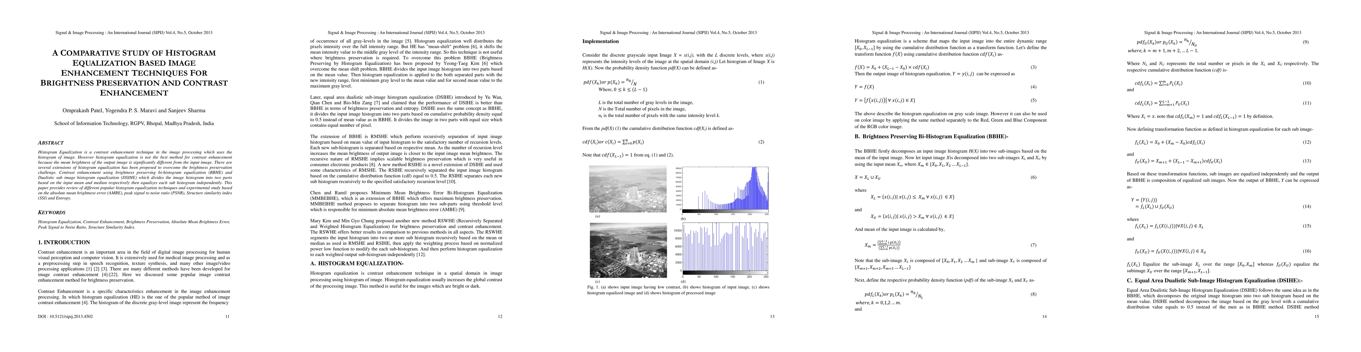 This paper reviews various histogram equalization techniques for image contrast enhancement, focusing on methods like BBHE and DSIHE that aim to preserve brightness. An experimental comparison evaluates these techniques based on AMBE, PSNR, SSI, and entropy.