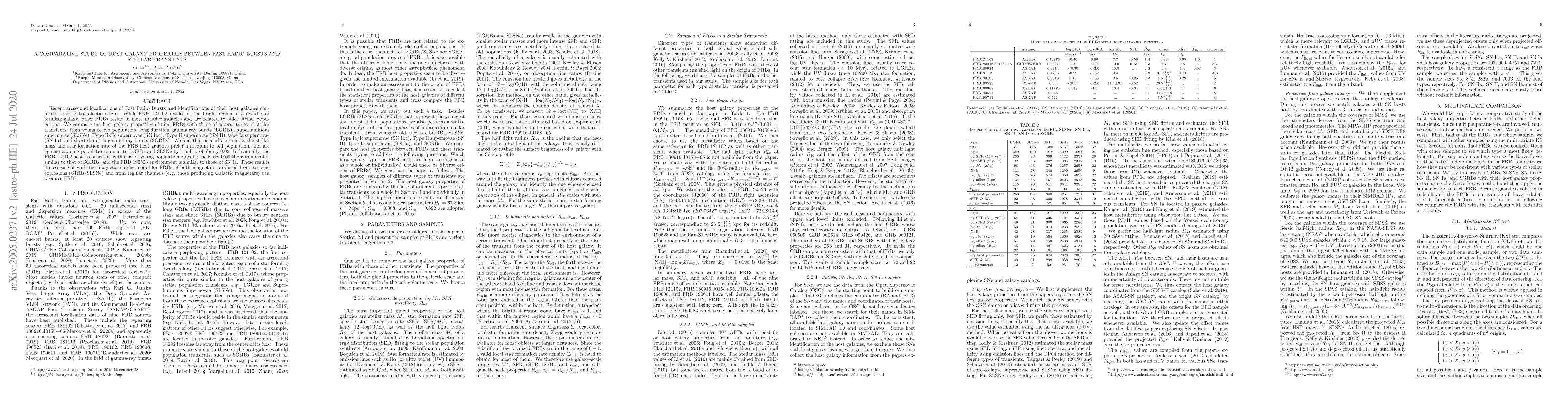 This study compares the host galaxy properties of nine Fast Radio Bursts (FRBs) with various stellar transients, finding that FRB host galaxies generally prefer medium to old stellar populations, contrasting with young populations typical of long-duration gamma-ray bursts and superluminous supernovae. Individual FRBs show varied environments, supporting the magnetar engine model for FRBs.
