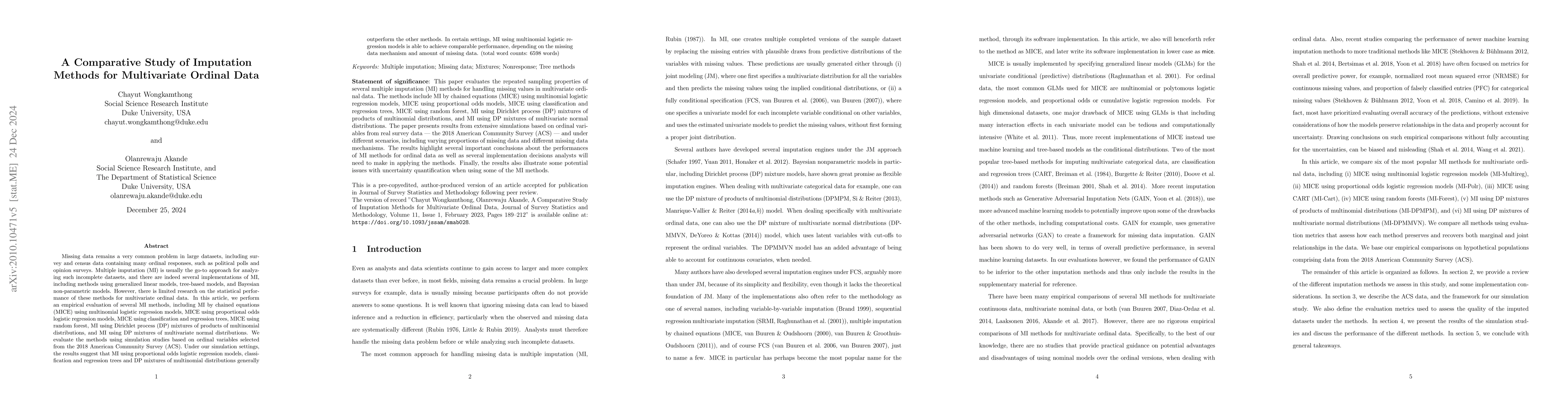 This paper evaluates several multiple imputation methods for handling missing data in multivariate ordinal datasets, finding that MI using proportional odds logistic regression, classification and regression trees, and Dirichlet process mixtures of multinomial distributions generally perform best. The study uses simulation data from the 2018 American Community Survey to assess these methods.