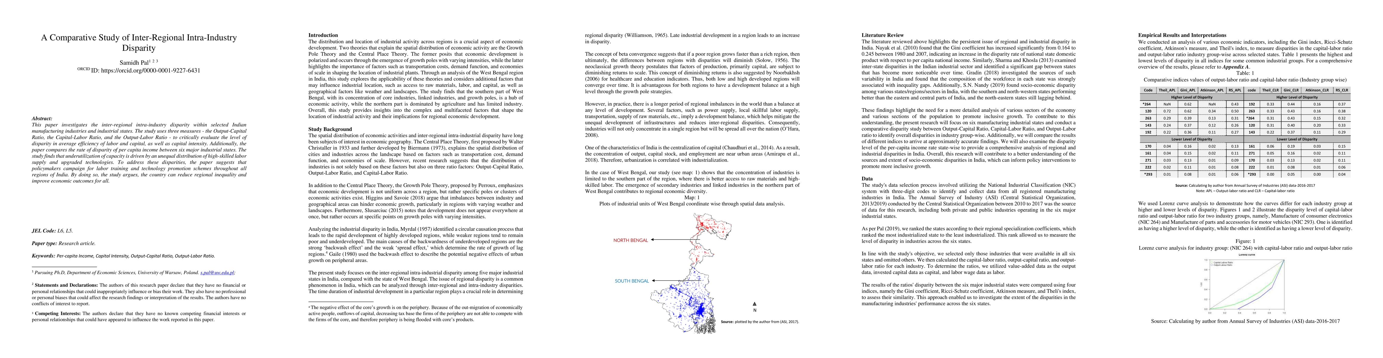 This paper investigates the inter-regional intra-industry disparity within selected Indian manufacturing industries and industrial states. The study uses three measures - the Output-Capital Ratio, the Capital-Labor Ratio, and the Output-Labor Ratio - to critically evaluate the level of disparity in average efficiency of labor and capital, as well as capital intensity. Additionally, the paper compares the rate of disparity of per capita income between six major industrial states. The study finds that underutilization of capacity is driven by an unequal distribution of high-skilled labor supply and upgraded technologies. To address these disparities, the paper suggests that policymakers campaign for labor training and technology promotion schemes throughout all regions of India. By doing so, the study argues, the country can reduce regional inequality and improve economic outcomes for all.