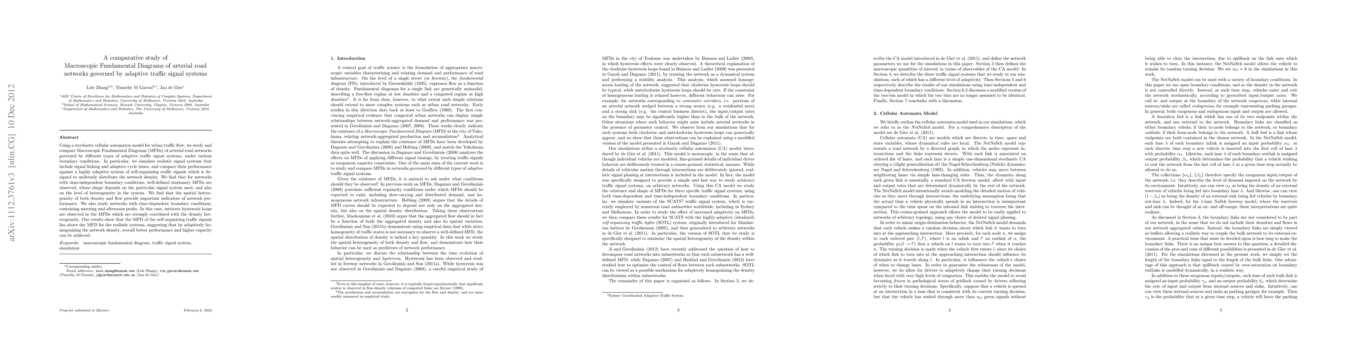 Using a stochastic cellular automaton model for urban traffic flow, we study and compare Macroscopic Fundamental Diagrams (MFDs) of arterial road networks governed by different types of adaptive traffic signal systems, under various boundary conditions. In particular, we simulate realistic signal systems that include signal linking and adaptive cycle times, and compare their performance against a highly adaptive system of self-organizing traffic signals which is designed to uniformly distribute the network density. We find that for networks with time-independent boundary conditions, well-defined stationary MFDs are observed, whose shape depends on the particular signal system used, and also on the level of heterogeneity in the system. We find that the spatial heterogeneity of both density and flow provide important indicators of network performance. We also study networks with time-dependent boundary conditions, containing morning and afternoon peaks. In this case, intricate hysteresis loops are observed in the MFDs which are strongly correlated with the density heterogeneity. Our results show that the MFD of the self-organizing traffic signals lies above the MFD for the realistic systems, suggesting that by adaptively homogenizing the network density, overall better performance and higher capacity can be achieved.