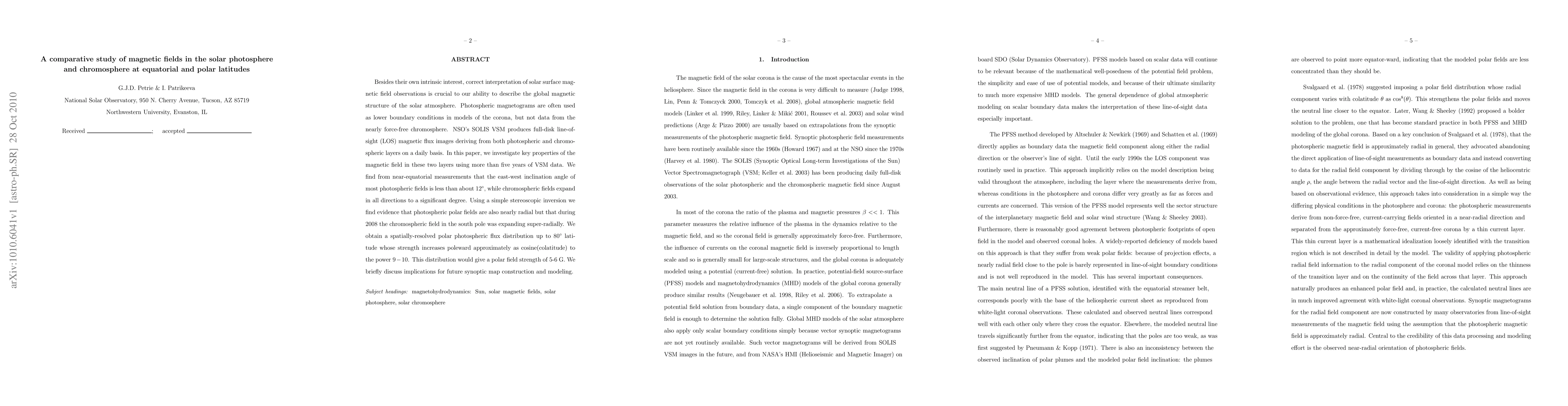 This study compares magnetic fields in the solar photosphere and chromosphere at equatorial and polar latitudes using five years of data from the NSO's VSM. It finds that photospheric fields are mostly radial, while chromospheric fields exhibit more directional expansion, with notable superradial expansion in the south pole during 2008.