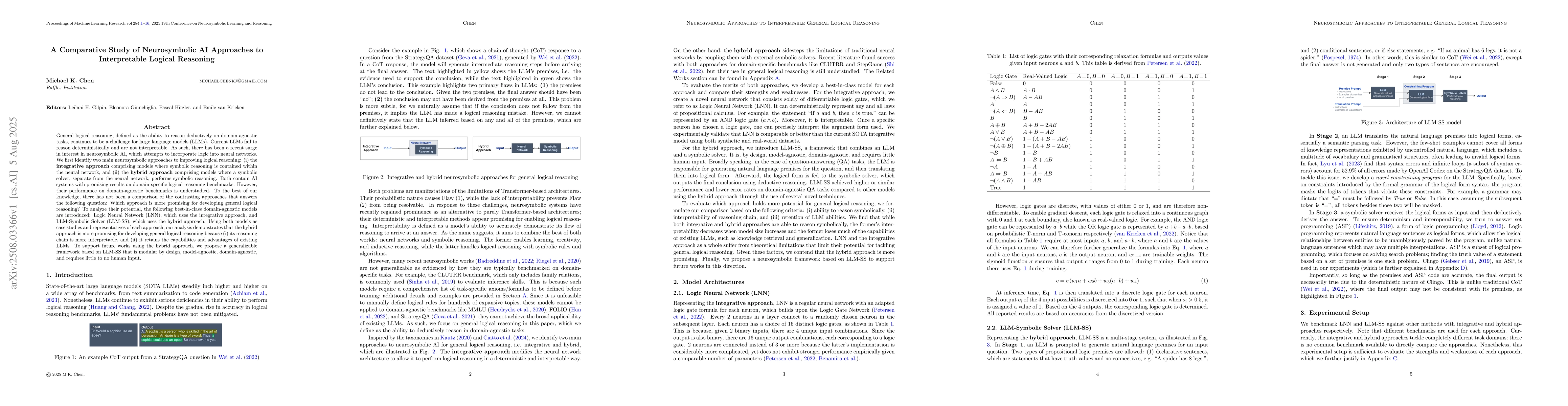 General logical reasoning, defined as the ability to reason deductively on domain-agnostic tasks, continues to be a challenge for large language models (LLMs). Current LLMs fail to reason deterministically and are not interpretable. As such, there has been a recent surge in interest in neurosymbolic AI, which attempts to incorporate logic into neural networks. We first identify two main neurosymbolic approaches to improving logical reasoning: (i) the integrative approach comprising models where symbolic reasoning is contained within the neural network, and (ii) the hybrid approach comprising models where a symbolic solver, separate from the neural network, performs symbolic reasoning. Both contain AI systems with promising results on domain-specific logical reasoning benchmarks. However, their performance on domain-agnostic benchmarks is understudied. To the best of our knowledge, there has not been a comparison of the contrasting approaches that answers the following question: Which approach is more promising for developing general logical reasoning? To analyze their potential, the following best-in-class domain-agnostic models are introduced: Logic Neural Network (LNN), which uses the integrative approach, and LLM-Symbolic Solver (LLM-SS), which uses the hybrid approach. Using both models as case studies and representatives of each approach, our analysis demonstrates that the hybrid approach is more promising for developing general logical reasoning because (i) its reasoning chain is more interpretable, and (ii) it retains the capabilities and advantages of existing LLMs. To support future works using the hybrid approach, we propose a generalizable framework based on LLM-SS that is modular by design, model-agnostic, domain-agnostic, and requires little to no human input.