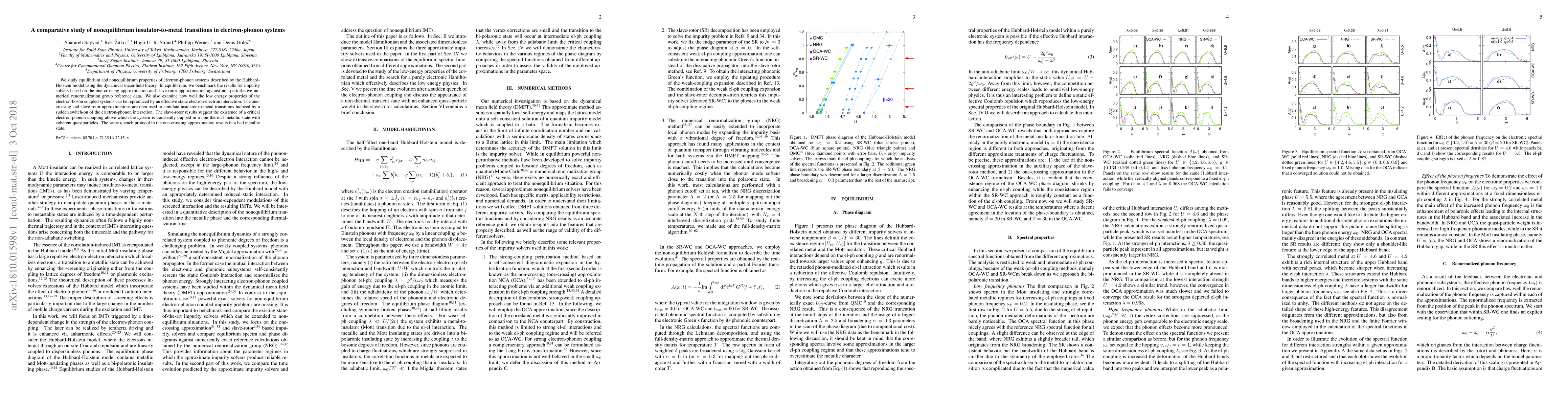We study equilibrium and nonequilibrium properties of electron-phonon systems described by the Hubbard-Holstein model using the dynamical mean-field theory. In equilibrium, we benchmark the results for impurity solvers based on the one-crossing approximation and slave-rotor approximation against non-perturbative numerical renormalization group reference data. We also examine how well the low energy properties of the electron-boson coupled systems can be reproduced by an effective static electron-electron interaction. The one-crossing and slave-rotor approximations are then used to simulate insulator-to-metal transitions induced by a sudden switch-on of the electron-phonon interaction. The slave-rotor results suggest the existence of a critical electron-phonon coupling above which the system is transiently trapped in a non-thermal metallic state with coherent quasiparticles. The same quench protocol in the one-crossing approximation results in a bad metallic state.