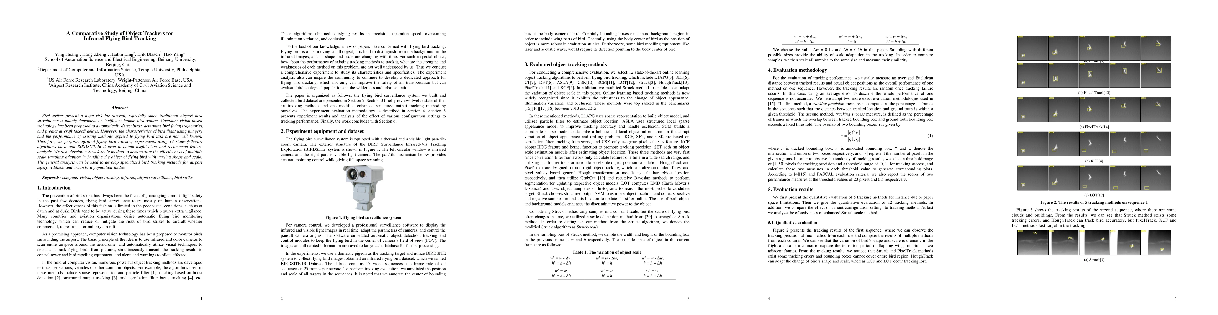Bird strikes present a huge risk for aircraft, especially since traditional airport bird surveillance is mainly dependent on inefficient human observation. Computer vision based technology has been proposed to automatically detect birds, determine bird flying trajectories, and predict aircraft takeoff delays. However, the characteristics of bird flight using imagery and the performance of existing methods applied to flying bird task are not well known. Therefore, we perform infrared flying bird tracking experiments using 12 state-of-the-art algorithms on a real BIRDSITE-IR dataset to obtain useful clues and recommend feature analysis. We also develop a Struck-scale method to demonstrate the effectiveness of multiple scale sampling adaption in handling the object of flying bird with varying shape and scale. The general analysis can be used to develop specialized bird tracking methods for airport safety, wildness and urban bird population studies.