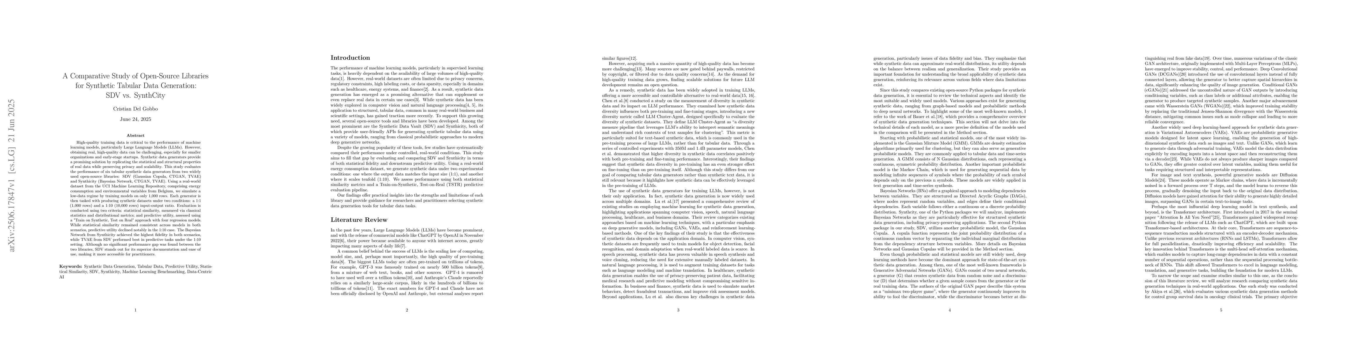 High-quality training data is critical to the performance of machine learning models, particularly Large Language Models (LLMs). However, obtaining real, high-quality data can be challenging, especially for smaller organizations and early-stage startups. Synthetic data generators provide a promising solution by replicating the statistical and structural properties of real data while preserving privacy and scalability. This study evaluates the performance of six tabular synthetic data generators from two widely used open-source libraries: SDV (Gaussian Copula, CTGAN, TVAE) and Synthicity (Bayesian Network, CTGAN, TVAE). Using a real-world dataset from the UCI Machine Learning Repository, comprising energy consumption and environmental variables from Belgium, we simulate a low-data regime by training models on only 1,000 rows. Each generator is then tasked with producing synthetic datasets under two conditions: a 1:1 (1,000 rows) and a 1:10 (10,000 rows) input-output ratio. Evaluation is conducted using two criteria: statistical similarity, measured via classical statistics and distributional metrics; and predictive utility, assessed using a "Train on Synthetic, Test on Real" approach with four regression models. While statistical similarity remained consistent across models in both scenarios, predictive utility declined notably in the 1:10 case. The Bayesian Network from Synthicity achieved the highest fidelity in both scenarios, while TVAE from SDV performed best in predictive tasks under the 1:10 setting. Although no significant performance gap was found between the two libraries, SDV stands out for its superior documentation and ease of use, making it more accessible for practitioners.