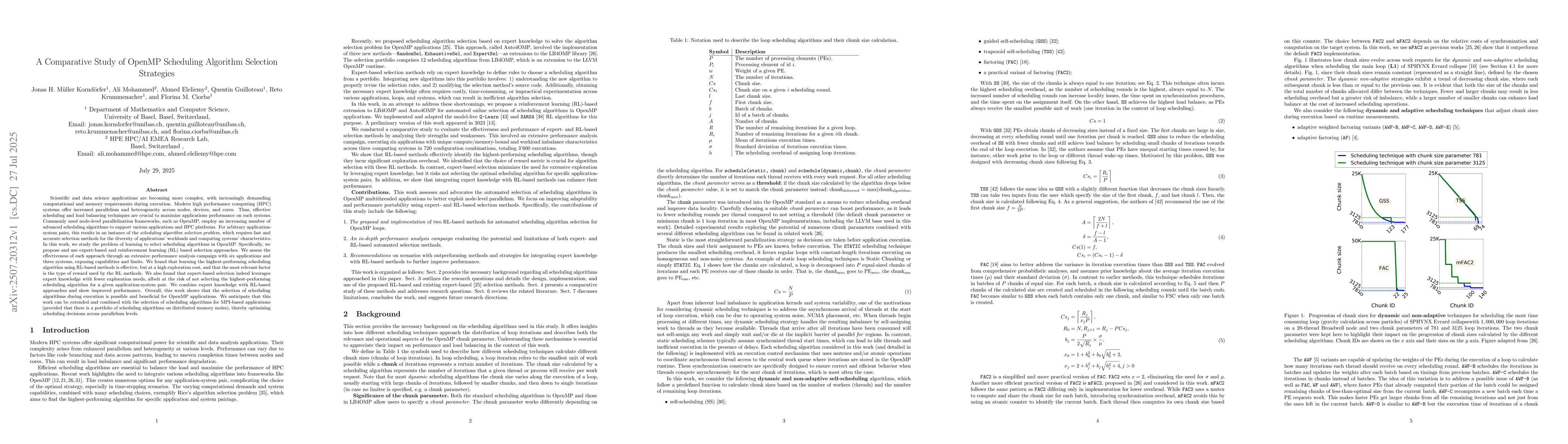 Scientific and data science applications are becoming increasingly complex, with growing computational and memory demands. Modern high performance computing (HPC) systems provide high parallelism and heterogeneity across nodes, devices, and cores. To achieve good performance, effective scheduling and load balancing techniques are essential. Parallel programming frameworks such as OpenMP now offer a variety of advanced scheduling algorithms to support diverse applications and platforms. This creates an instance of the scheduling algorithm selection problem, which involves identifying the most suitable algorithm for a given combination of workload and system characteristics. In this work, we explore learning-based approaches for selecting scheduling algorithms in OpenMP. We propose and evaluate expert-based and reinforcement learning (RL)-based methods, and conduct a detailed performance analysis across six applications and three systems. Our results show that RL methods are capable of learning high-performing scheduling decisions, although they require significant exploration, with the choice of reward function playing a key role. Expert-based methods, in contrast, rely on prior knowledge and involve less exploration, though they may not always identify the optimal algorithm for a specific application-system pair. By combining expert knowledge with RL-based learning, we achieve improved performance and greater adaptability. Overall, this work demonstrates that dynamic selection of scheduling algorithms during execution is both viable and beneficial for OpenMP applications. The approach can also be extended to MPI-based programs, enabling optimization of scheduling decisions across multiple levels of parallelism.