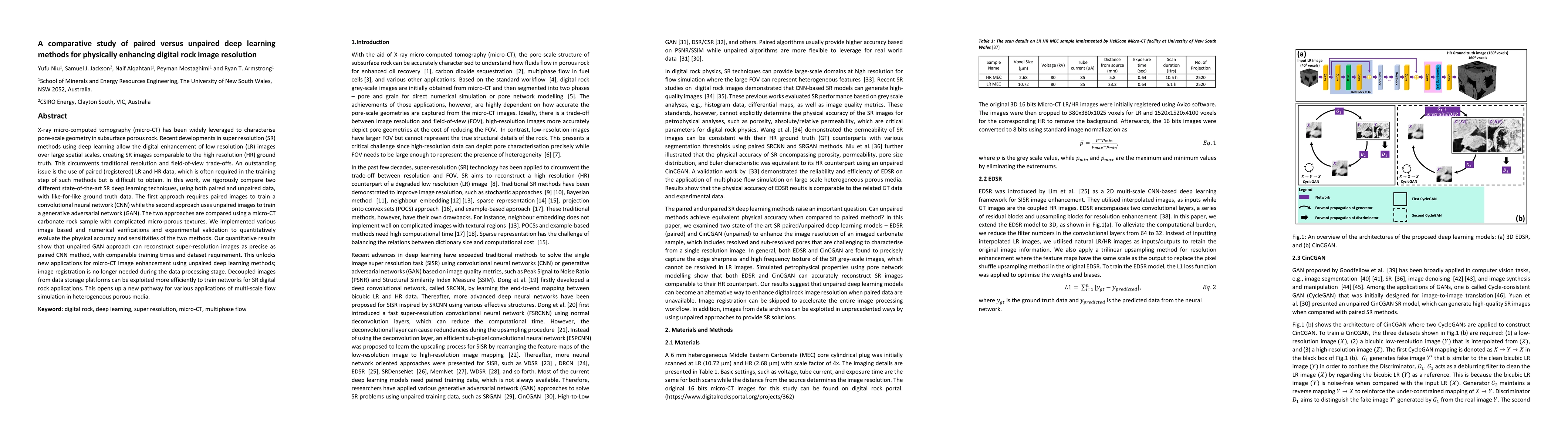 This research paper compares two deep learning methods for enhancing the resolution of digital rock images obtained via X-ray micro-CT. The study evaluates the performance of paired convolutional neural networks (CNN) and unpaired generative adversarial networks (GAN) in reconstructing high-resolution images from low-resolution inputs. The results indicate that the unpaired GAN approach can achieve similar accuracy to the paired CNN method, without requiring image registration, thus broadening the scope for practical applications in digital rock analysis and multi-scale flow simulations.