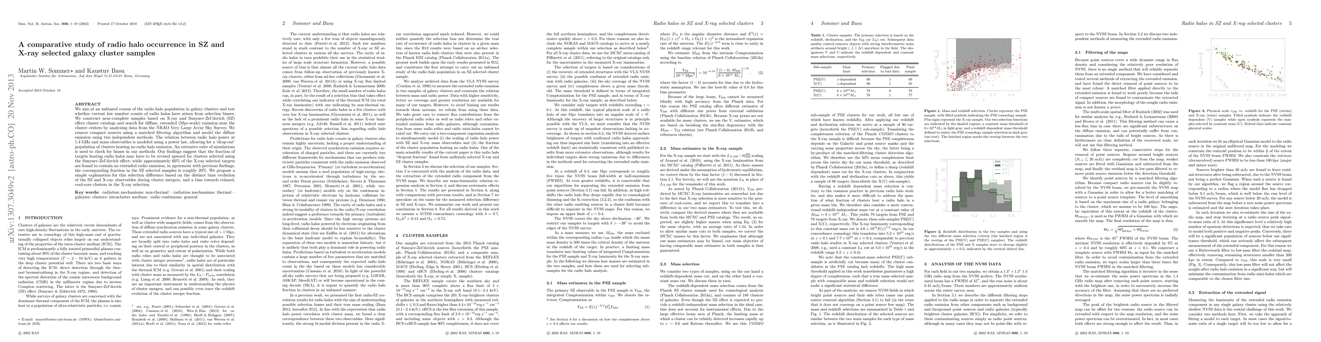 We aim at an unbiased census of the radio halo population in galaxy clusters and test whether current low number counts of radio halos have arisen from selection biases. We construct near-complete samples based on X-ray and Sunyaev-Zel'dovich (SZ) effect cluster catalogues and search for diffuse, extended (Mpc-scale) emission near the cluster centers by analyzing data from the National Radio Astronomy Observatory Very Large Array Sky Survey. We remove compact sources using a matched filtering algorithm and model the diffuse emission using two independent methods. The relation between radio halo power at 1.4 GHz and mass observables is modelled using a power law, allowing for a 'dropout' population of clusters hosting no radio halo emission. An extensive suite of simulations is used to check for biases in our methods. Our findings suggest that the fraction of targets hosting radio halos may have to be revised upwards for clusters selected using the SZ effect: while approximately 60 per cent of the X-ray selected targets are found to contain no extended radio emission, in agreement with previous findings, the corresponding fraction in the SZ selected samples is roughly 20 per cent. We propose a simple explanation for this selection difference based on the distinct time evolution of the SZ and X-ray observables during cluster mergers, and a bias towards relaxed, cool-core clusters in the X-ray selection.