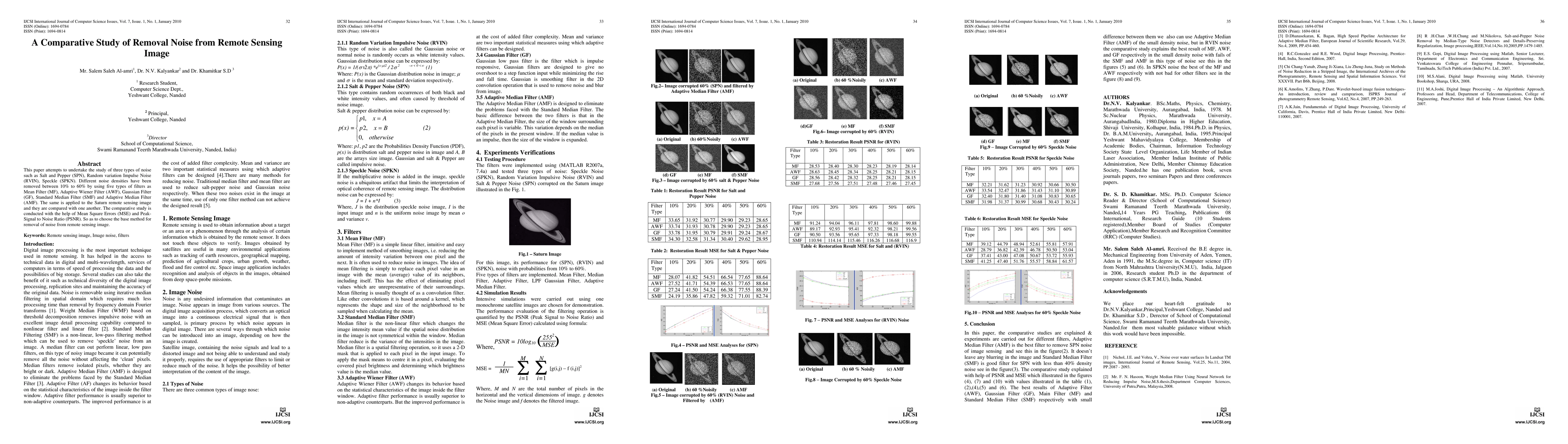 This paper attempts to undertake the study of three types of noise such as Salt and Pepper (SPN), Random variation Impulse Noise (RVIN), Speckle (SPKN). Different noise densities have been removed between 10% to 60% by using five types of filters as Mean Filter (MF), Adaptive Wiener Filter (AWF), Gaussian Filter (GF), Standard Median Filter (SMF) and Adaptive Median Filter (AMF). The same is applied to the Saturn remote sensing image and they are compared with one another. The comparative study is conducted with the help of Mean Square Errors (MSE) and Peak-Signal to Noise Ratio (PSNR). So as to choose the base method for removal of noise from remote sensing image.