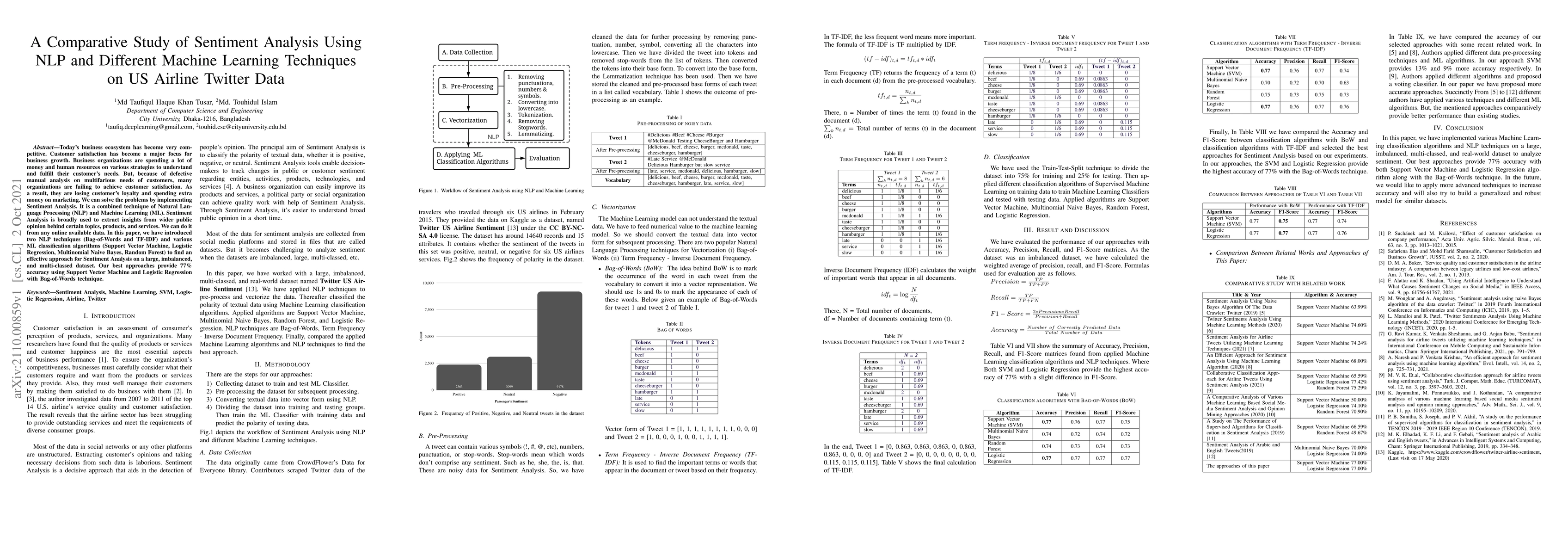 This paper compares NLP and various machine learning techniques for sentiment analysis on US airline Twitter data, finding that Support Vector Machine and Logistic Regression with Bag-of-Words achieve 77% accuracy. The study aims to improve customer satisfaction insights through automated sentiment analysis.