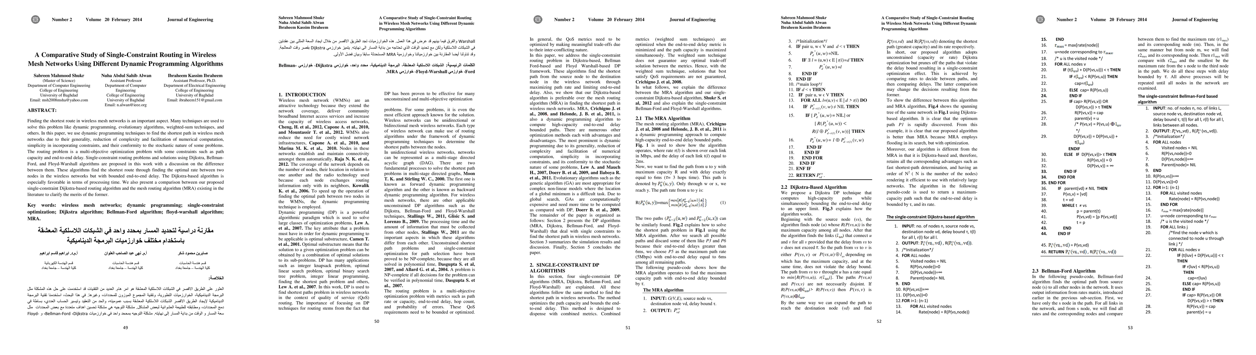 Finding the shortest route in wireless mesh networks is an important aspect. Many techniques are used to solve this problem like dynamic programming, evolutionary algorithms, weighted-sum techniques, and others. In this paper, we use dynamic programming techniques to find the shortest path in wireless mesh networks due to their generality, reduction of complexity and facilitation of numerical computation, simplicity in incorporating constraints, and their conformity to the stochastic nature of some problems. The routing problem is a multi-objective optimization problem with some constraints such as path capacity and end-to-end delay. Single-constraint routing problems and solutions using Dijkstra, Bellman- Ford, and Floyd-Warshall algorithms are proposed in this work with a discussion on the difference between them. These algorithms find the shortest route through finding the optimal rate between two nodes in the wireless networks but with bounded end-to-end delay. The Dijkstra-based algorithm is especially favorable in terms of processing time. We also present a comparison between our proposed single-constraint Dijkstra-based routing algorithm and the mesh routing algorithm (MRA) existing in the literature to clarify the merits of the former.