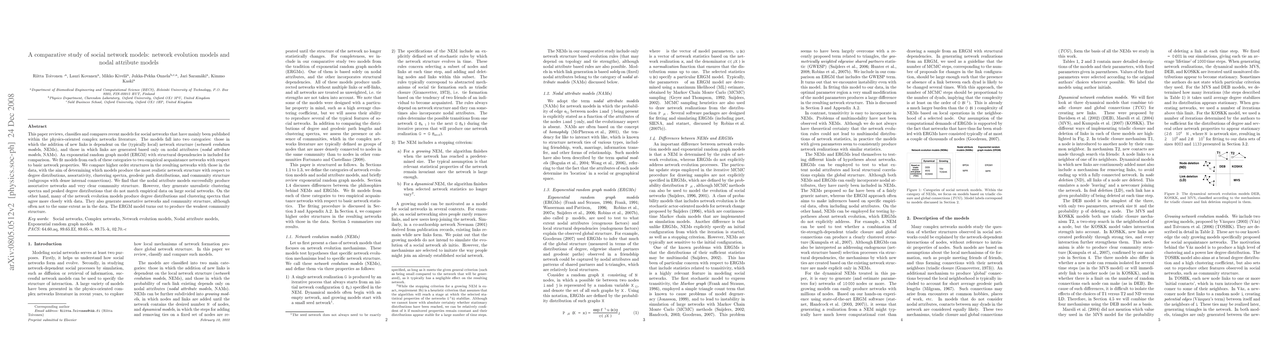 This paper reviews, classifies and compares recent models for social networks that have mainly been published within the physics-oriented complex networks literature. The models fall into two categories: those in which the addition of new links is dependent on the (typically local) network structure (network evolution models, NEMs), and those in which links are generated based only on nodal attributes (nodal attribute models, NAMs). An exponential random graph model (ERGM) with structural dependencies is included for comparison. We fit models from each of these categories to two empirical acquaintance networks with respect to basic network properties. We compare higher order structures in the resulting networks with those in the data, with the aim of determining which models produce the most realistic network structure with respect to degree distributions, assortativity, clustering spectra, geodesic path distributions, and community structure (subgroups with dense internal connections). We find that the nodal attribute models successfully produce assortative networks and very clear community structure. However, they generate unrealistic clustering spectra and peaked degree distributions that do not match empirical data on large social networks. On the other hand, many of the network evolution models produce degree distributions and clustering spectra that agree more closely with data. They also generate assortative networks and community structure, although often not to the same extent as in the data. The ERG model turns out to produce the weakest community structure.