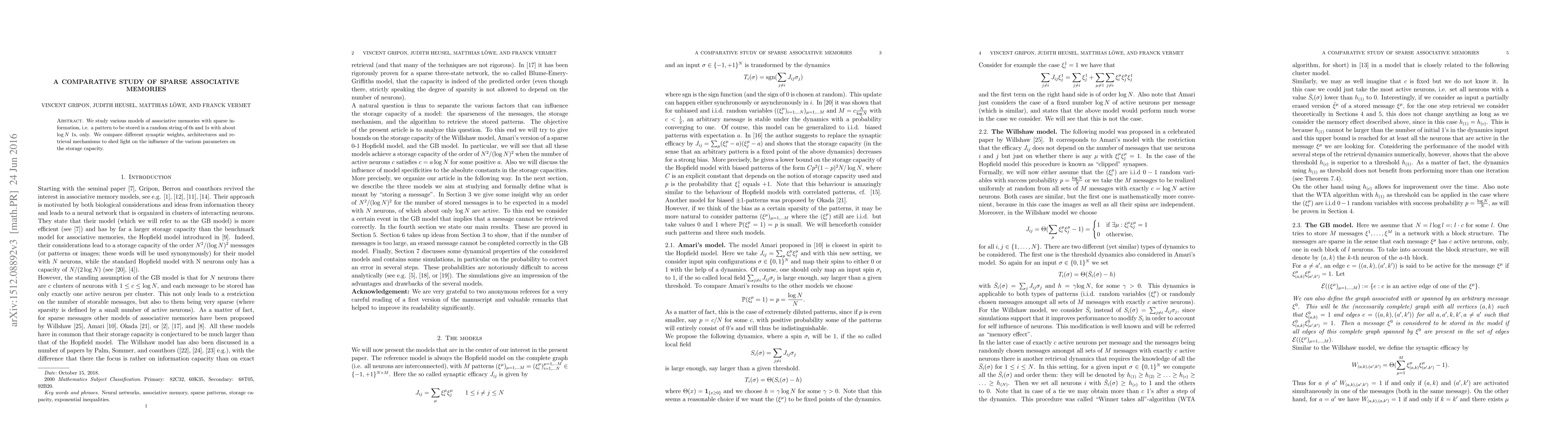 We study various models of associative memories with sparse information, i.e. a pattern to be stored is a random string of $0$s and $1$s with about $\log N$ $1$s, only. We compare different synaptic weights, architectures and retrieval mechanisms to shed light on the influence of the various parameters on the storage capacity.
