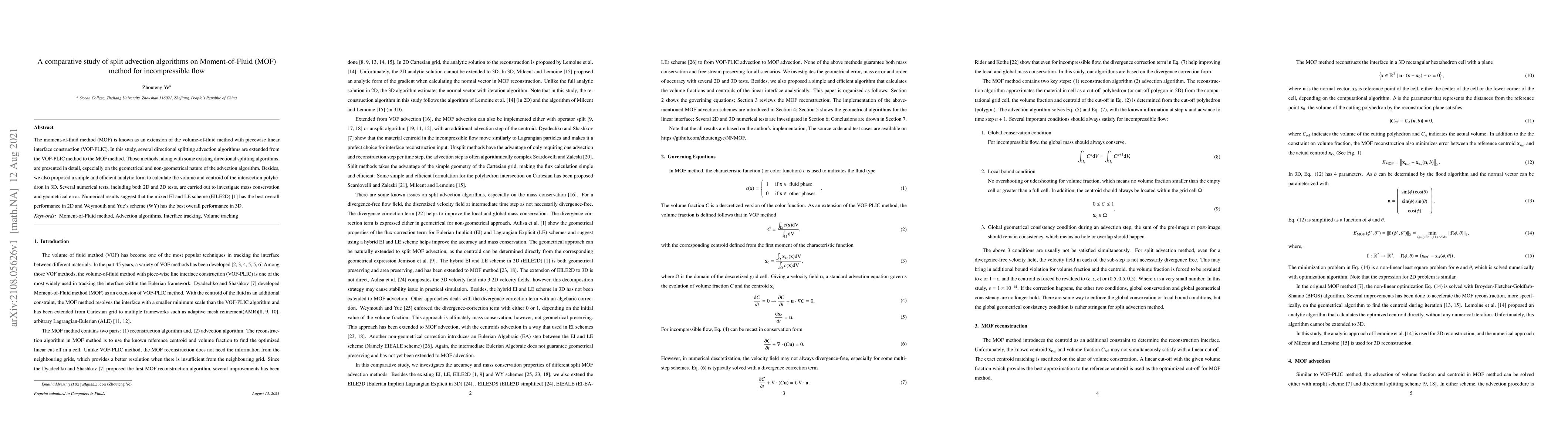 The moment-of-fluid method (MOF) is known as an extension of the volume-of-fluid method with piecewise linear interface construction (VOF-PLIC). In this study, several directional splitting advection algorithms are extended from the VOF-PLIC method to the MOF method. Those methods, along with some existing directional splitting algorithms, are presented in detail, especially on the geometrical and non-geometrical nature of the advection algorithm. Besides, we also proposed a simple and efficient analytic form to calculate the volume and centroid of the intersection polyhedron in 3D. Several numerical tests, including both 2D and 3D tests, are carried out to investigate mass conservation and geometrical error. Numerical results suggest that the mixed EI and LE scheme (EILE2D) \citep{aulisa_geometrical_2003} has the best overall performance in 2D and Weymouth and Yue's scheme (WY) has the best overall performance in 3D.