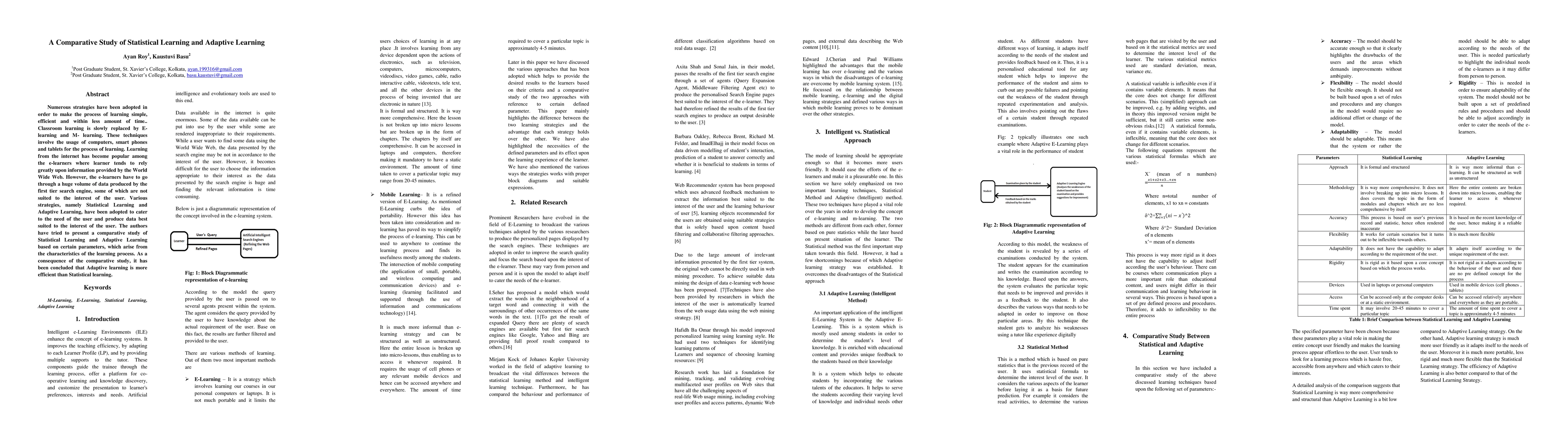 Numerous strategies have been adopted in order to make the process of learning simple, efficient and within less amount of time.. Classroom learning is slowly replaced by E-learning and M- learning. These techniques involve the usage of computers, smart phones and tablets for the process of learning. Learning from the internet has become popular among the e-learners where learner tends to rely greatly upon information provided by the World Wide Web. However, the e-learners have to go through a huge volume of data produced by the first tier search engine, some of which are not suited to the interest of the user. Various strategies, namely Statistical Learning and Adaptive Learning, have been adopted to cater to the need of the user and produce data best suited to the interest of the user. The authors have tried to present a comparative study of Statistical Learning and Adaptive Learning based on certain parameters, which arise from the characteristics of the learning process. As a consequence of the comparative study, it has been concluded that Adaptive learning is more efficient than Statistical learning.