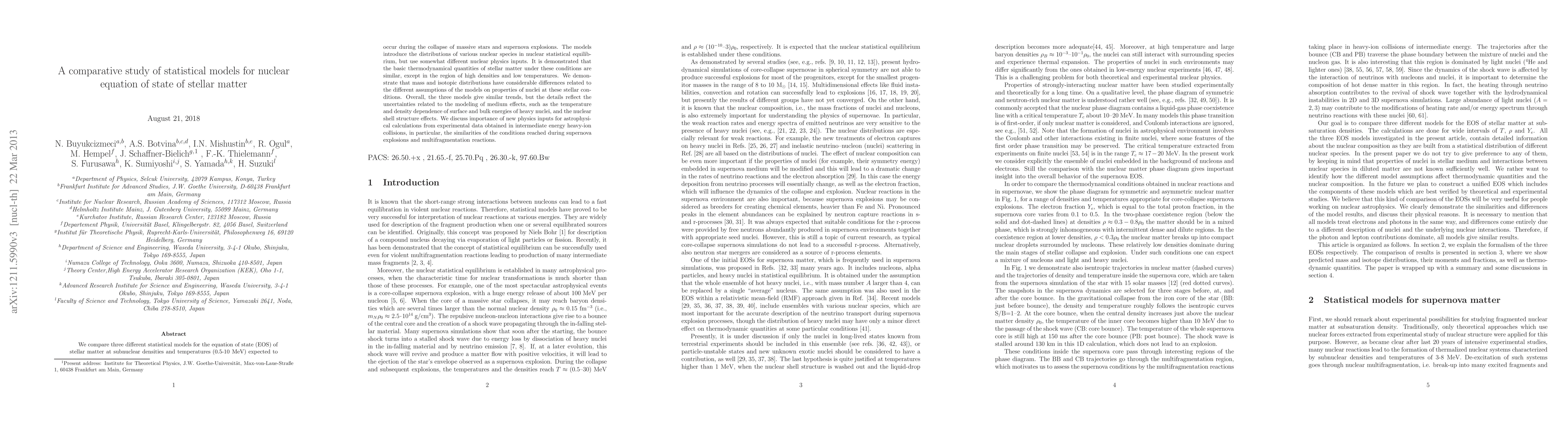 We compare three different statistical models for the equation of state (EOS) of stellar matter at subnuclear densities and temperatures (0.5-10 MeV) expected to occur during the collapse of massive stars and supernova explosions. The models introduce the distributions of various nuclear species in nuclear statistical equilibrium, but use somewhat different nuclear physics inputs. It is demonstrated that the basic thermodynamical quantities of stellar matter under these conditions are similar, except in the region of high densities and low temperatures. We demonstrate that mass and isotopic distributions have considerable differences related to the different assumptions of the models on properties of nuclei at these stellar conditions. Overall, the three models give similar trends, but the details reflect the uncertainties related to the modeling of medium effects, such as the temperature and density dependence of surface and bulk energies of heavy nuclei, and the nuclear shell structure effects. We discuss importance of new physics inputs for astrophysical calculations from experimental data obtained in intermediate energy heavy-ion collisions, in particular, the similarities of the conditions reached during supernova explosions and multifragmentation reactions.