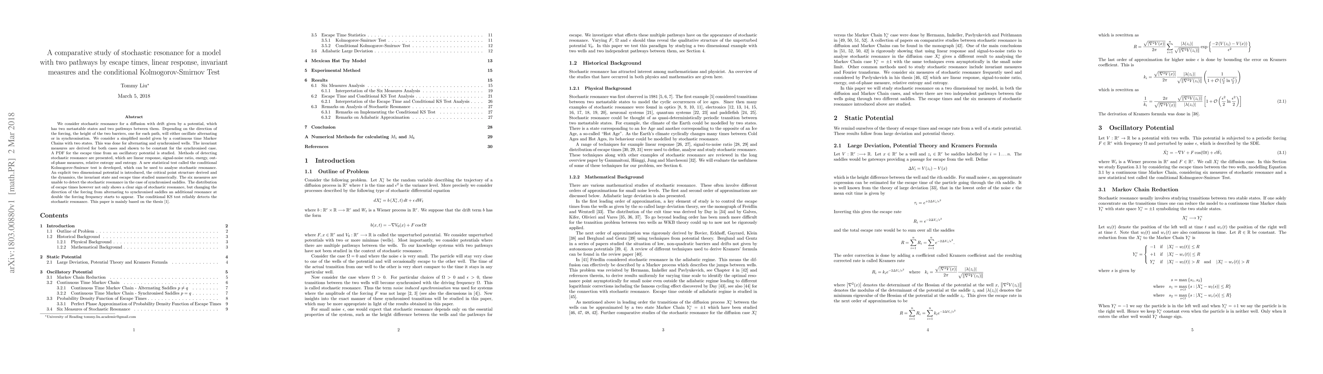 We consider stochastic resonance for a diffusion with drift given by a potential, which has two metastable states and two pathways between them. Depending on the direction of the forcing, the height of the two barriers, one for each path, will either oscillate alternating or in synchronisation. We consider a simplified model given by a continuous time Markov Chains with two states. This was done for alternating and synchronised wells. The invariant measures are derived for both cases and shown to be constant for the synchronised case. A PDF for the escape time from an oscillatory potential is studied. Methods of detecting stochastic resonance are presented, which are linear response, signal-noise ratio, energy, out-of-phase measures, relative entropy and entropy. A new statistical test called the conditional Kolmogorov-Smirnov test is developed, which can be used to analyse stochastic resonance. An explicit two dimensional potential is introduced, the critical point structure derived and the dynamics, the invariant state and escape time studied numerically. The six measures are unable to detect the stochastic resonance in the case of synchronised saddles. The distribution of escape times however not only shows a clear sign of stochastic resonance, but changing the direction of the forcing from alternating to synchronised saddles an additional resonance at double the forcing frequency starts to appear. The conditional KS test reliably detects the stochastic resonance. This paper is mainly based on the thesis "Stochastic Resonance for a Model with Two Pathways"