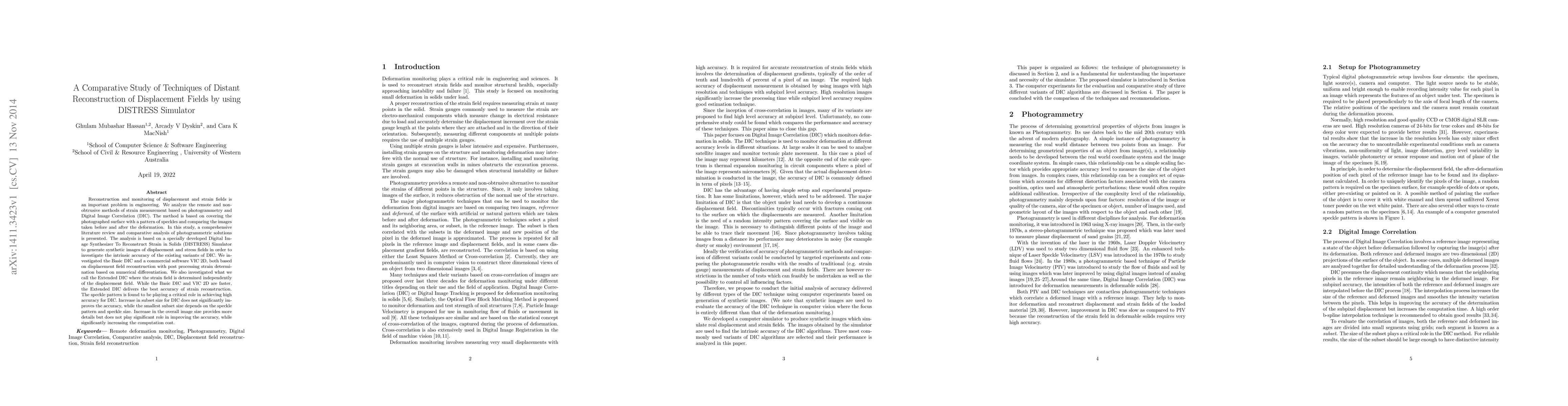 Reconstruction and monitoring of displacement and strain fields is an important problem in engineering. We analyze the remote and non-obtrusive methods of strain measurement based on photogrammetry and Digital Image Correlation (DIC). The method is based on covering the photographed surface with a pattern of speckles and comparing the images taken before and after the deformation. In this study, a comprehensive literature review and comparative analysis of photogrammetric solutions is presented. The analysis is based on a specially developed Digital Image Synthesizer To Reconstruct Strain in Solids (DISTRESS) Simulator to generate synthetic images of displacement and stress fields in order to investigate the intrinsic accuracy of the existing variants of DIC. We investigated the Basic DIC and a commercial software VIC 2D, both based on displacement field reconstruction with post processing strain determination based on numerical differentiation. We also investigated what we call the Extended DIC where the strain field is determined independently of the displacement field. While the Basic DIC and VIC 2D are faster, the Extended DIC delivers the best accuracy of strain reconstruction. The speckle pattern is found to be playing a critical role in achieving high accuracy for DIC. Increase in subset size for DIC does not significantly improves the accuracy, while the smallest subset size depends on the speckle pattern and speckle size. Increase in the overall image size provides more details but does not play significant role in improving the accuracy, while significantly increasing the computation cost.