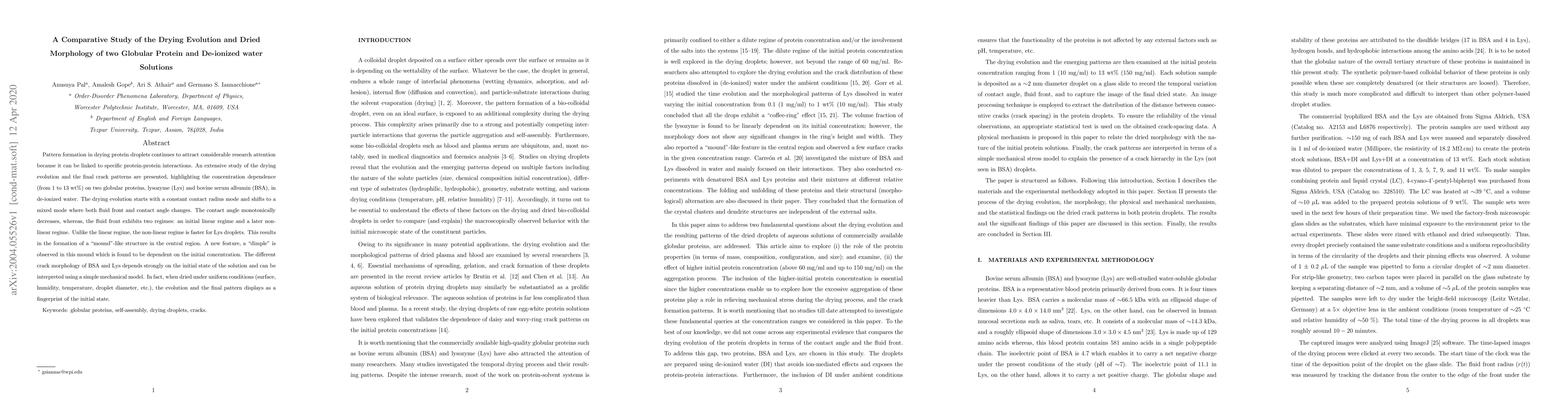 Pattern formation in drying protein droplets continues to attract considerable research attention because it can be linked to specific protein-protein interactions. An extensive study of the drying evolution and the final crack patterns are presented, highlighting the concentration dependence (from 1 to 13 wt%) on two globular proteins, lysozyme (Lys) and bovine serum albumin (BSA), in de-ionized water. The drying evolution starts with a constant contact radius mode and shifts to a mixed mode where both fluid front and contact angle changes. The contact angle monotonically decreases, whereas, the fluid front exhibits two regimes: an initial linear regime and a later nonlinear regime. Unlike the linear regime, the non-linear regime is faster for Lys droplets. This results in the formation of a "mound"-like structure in the central region. A new feature, a "dimple" is observed in this mound which is found to be dependent on the initial concentration. The different crack morphology of BSA and Lys depends strongly on the initial state of the solution and can be interpreted using a simple mechanical model. In fact, when dried under uniform conditions (surface, humidity, temperature, droplet diameter, etc.), the evolution and the final pattern displays as a fingerprint of the initial state.