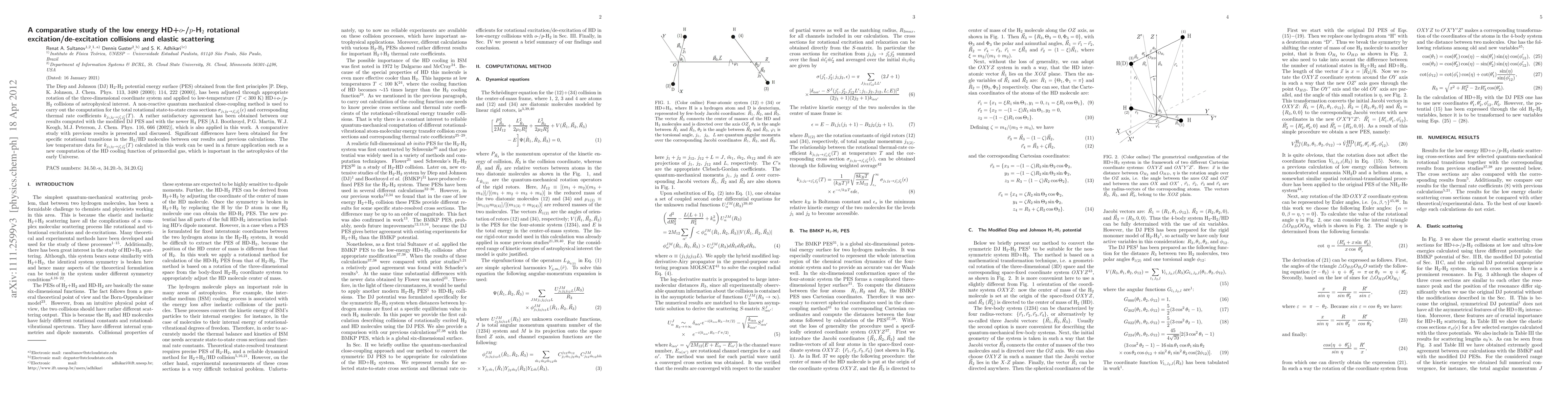 This study compares low-temperature HD+o-/p-H$_2$ rotational excitation/de-excitation collisions using the modified Diep and Johnson potential and a non-reactive quantum mechanical close-coupling method. Results show significant differences from previous calculations for certain transitions and can inform future astrophysical models of HD cooling in primordial gas.