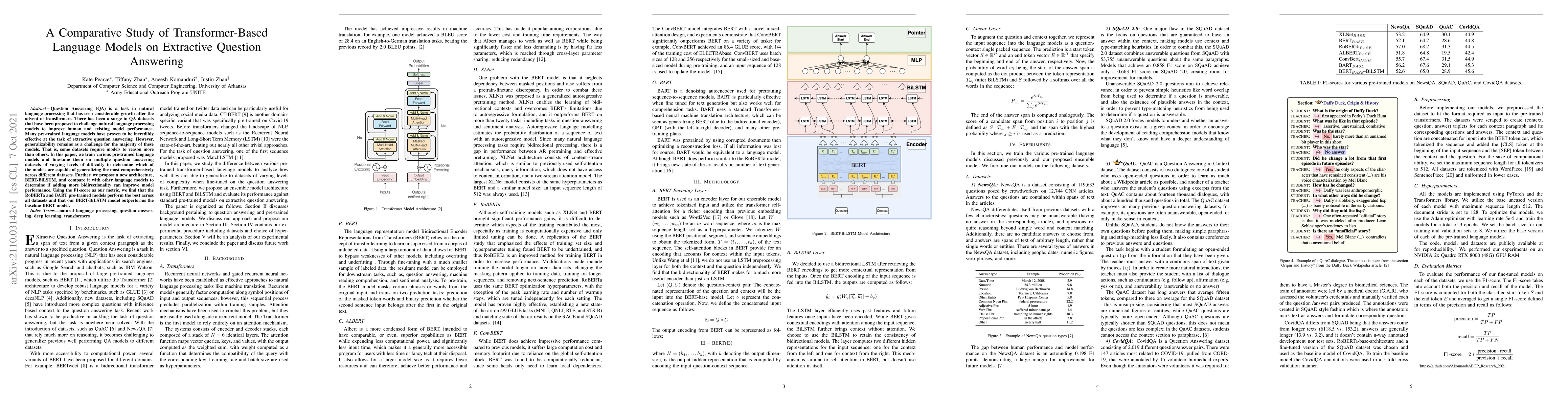 This paper investigates the performance of various transformer-based language models on extractive question answering tasks across diverse datasets. The study finds that RoBERTa and BART models exhibit the best generalizability, while the proposed BERT-BiLSTM model outperforms the baseline BERT model in terms of F1-score.