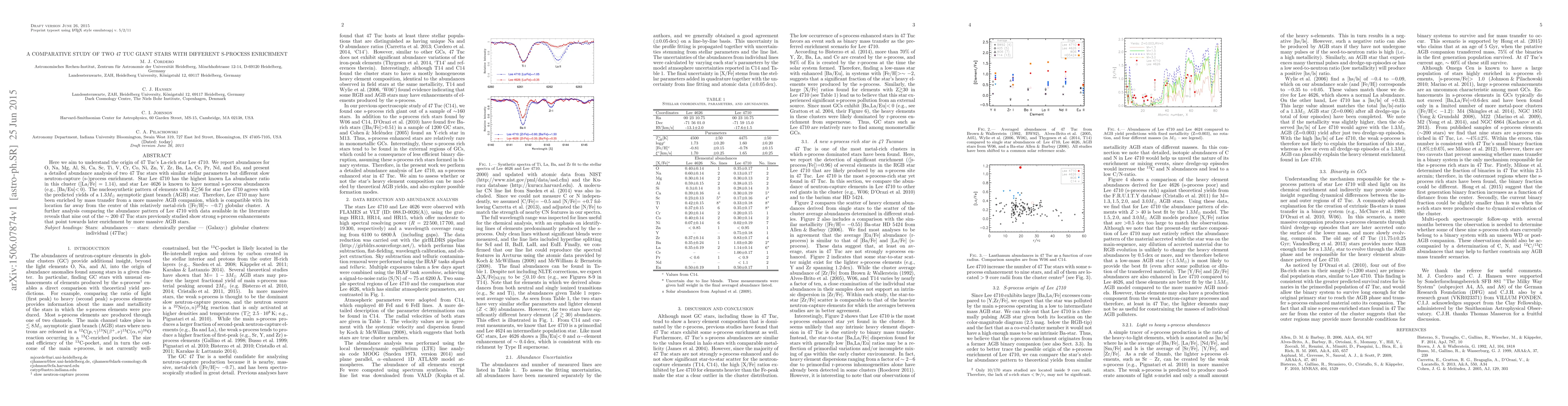 This study compares two giant stars in the 47 Tuc globular cluster, focusing on their differing s-process enrichment. Star Lee 4710 exhibits exceptionally high lanthanum abundance, suggesting enrichment from a more massive asymptotic giant branch companion, while star Lee 4626 has normal s-process abundances.