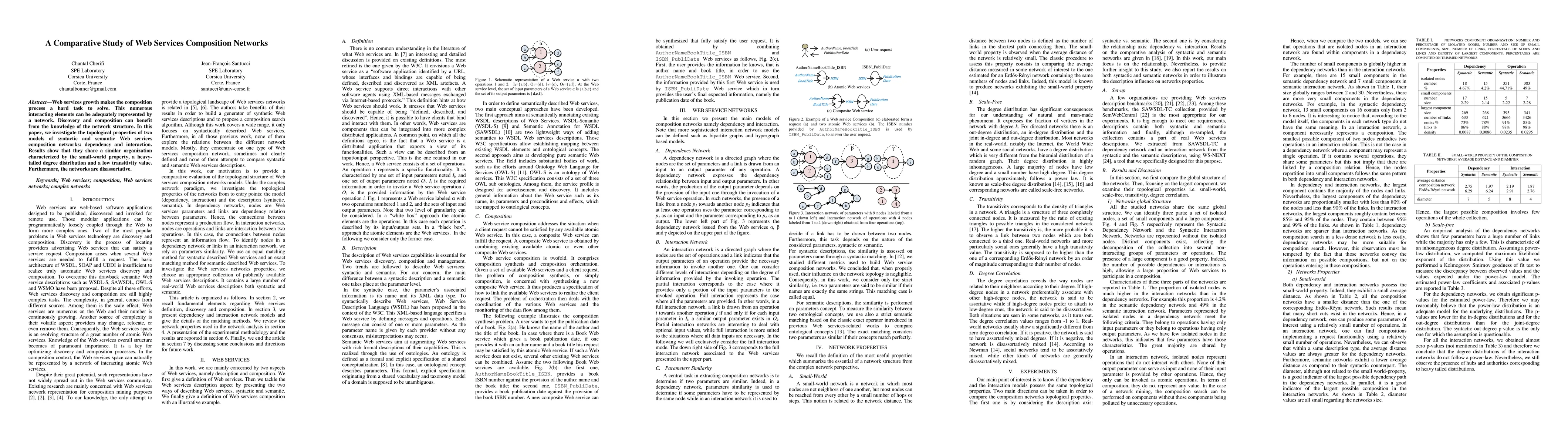 This paper examines the topological properties of syntactic and semantic Web services composition networks, finding they exhibit small-world characteristics, heavy-tailed degree distributions, low transitivity, and disassortative mixing. These properties suggest potential benefits for discovery and composition processes.