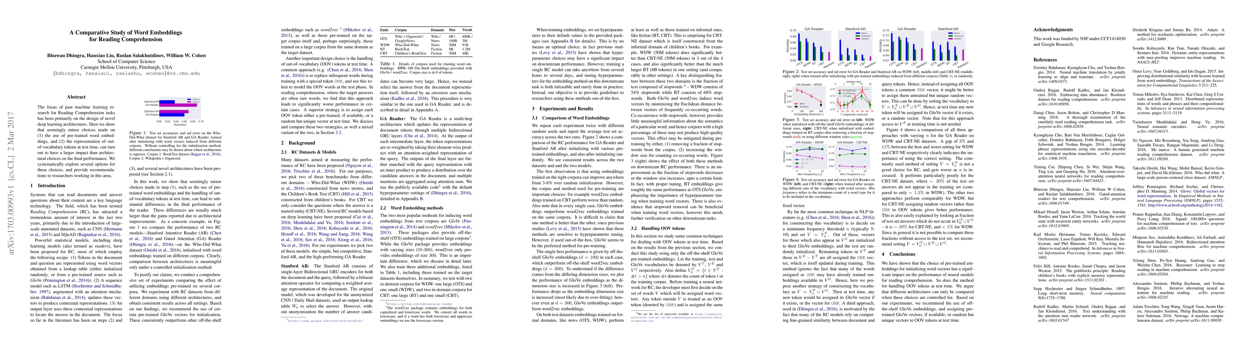 The paper presents a comparative analysis of word embeddings for reading comprehension, emphasizing the importance of pre-training corpora and OOV token handling strategies.