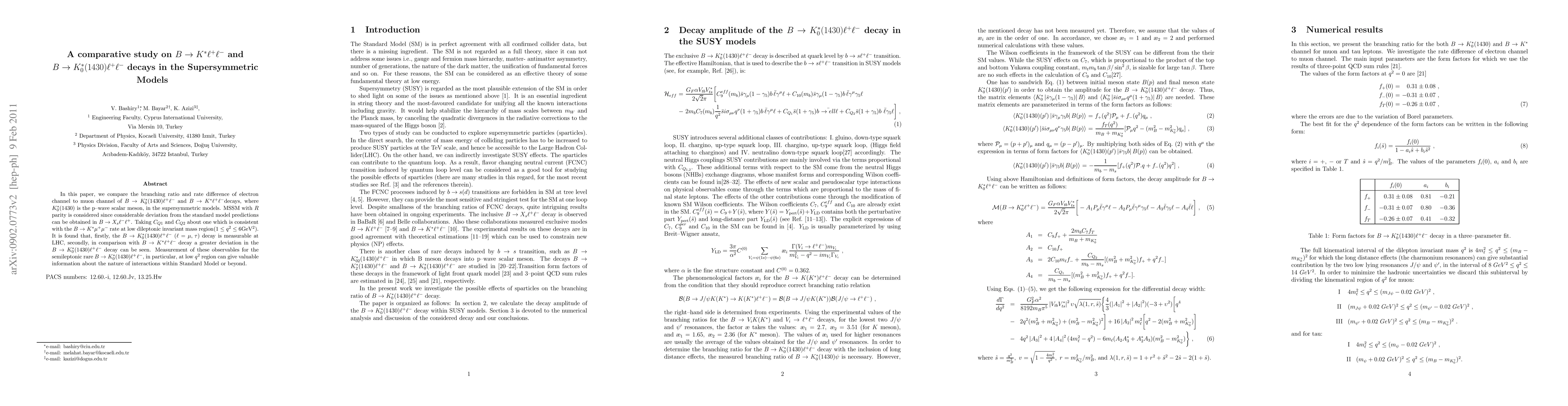 This paper compares the branching ratios and rate differences between electron and muon channels in $B \rightarrow K^\ast \ell^+ \ell^-$ and $B \rightarrow K_0^\ast (1430) \ell^+ \ell^-$ decays within supersymmetric models, finding greater deviations in the latter, which could provide insights into interactions beyond the Standard Model.