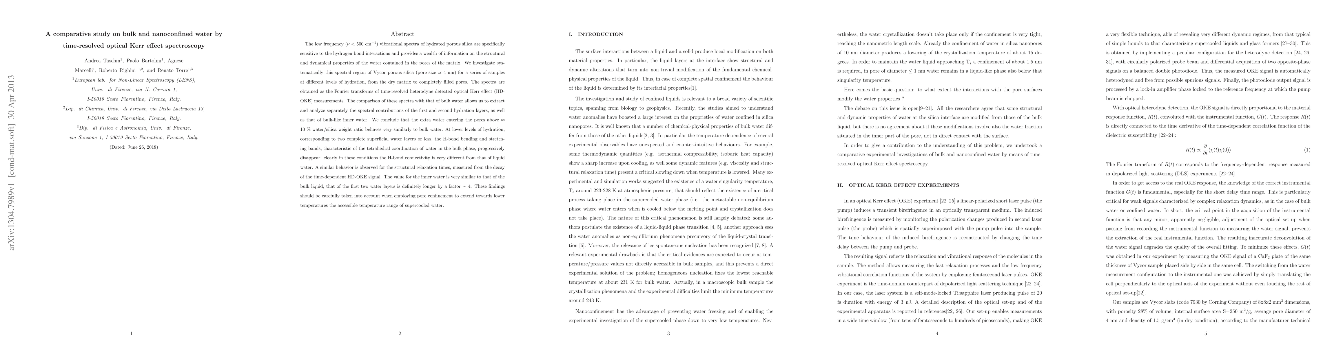 The low frequency vibrational spectra of hydrated porous silica are specifically sensitive to the hydrogen bond interactions and provides a wealth of information on the structural and dynamical properties of the water contained in the pores of the matrix. We investigate systematically this spectral region of Vycor porous silica (pore size about 4 nm) for a series of samples at different levels of hydration, from the dry matrix to completely filled pores. The spectra are obtained as the Fourier transforms of time-resolved heterodyne detected optical Kerr effect (HD- OKE) measurements. The comparison of these spectra with that of bulk water allows us to extract and analyze separately the spectral contributions of the first and second hydration layers, as well as that of bulk-like inner water. We conclude that the extra water entering the pores above 10 % water/silica weight ratio behaves very similarly to bulk water. At lower levels of hydration, corresponding to two complete superficial water layers or less, the H-bond bending and stretching bands, characteristic of the tetrahedral coordination of water in the bulk phase, progressively disappear: clearly in these conditions the H-bond connectivity is very different from that of liquid water. A similar behavior is observed for the structural relaxation times, measured from the decay of the time-dependent HD-OKE signal. The value for the inner water is very similar to that of the bulk liquid; that of the first two water layers is definitely longer by about a factor 4. These findings should be carefully taken into account when employing pore confinement to extend towards lower temperatures the accessible temperature range of supercooled water.