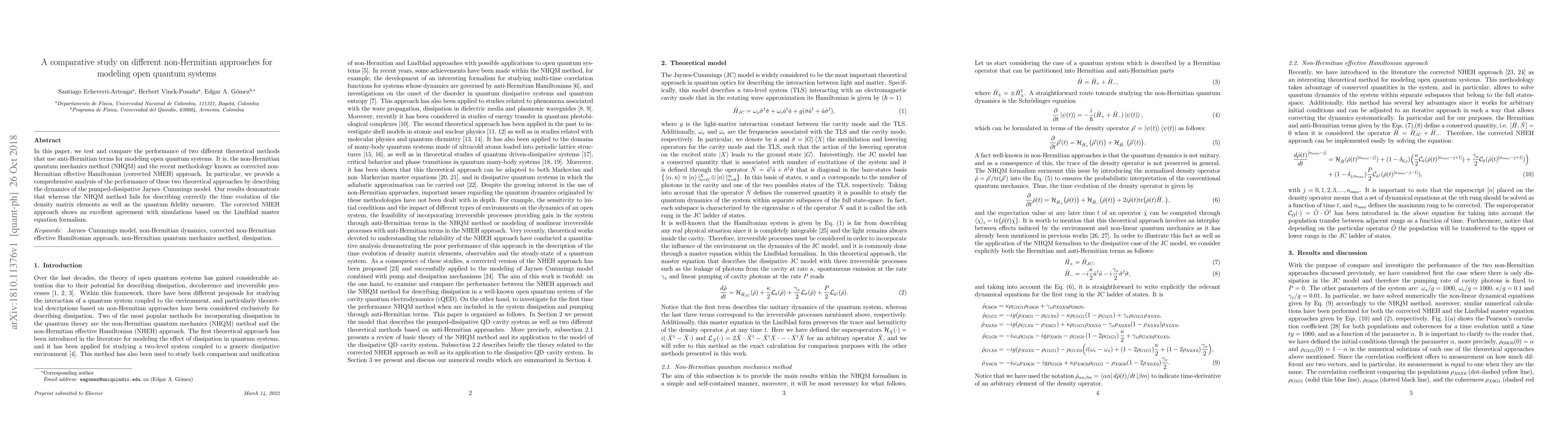 In this paper, we test and compare the performance of two different theoretical methods that use anti-Hermitian terms for modeling open quantum systems. It is, the non-Hermitian quantum mechanics method (NHQM) and the recent methodology known as corrected non-Hermitian effective Hamiltonian (corrected NHEH) approach. In particular, we provide a comprehensive analysis of the performance of these two theoretical approaches by describing the dynamics of the pumped-dissipative Jaynes--Cummings model. Our results demonstrate that whereas the NHQM method fails for describing correctly the time evolution of the density matrix elements as well as the quantum fidelity measure. The corrected NHEH approach shows an excellent agreement with simulations based on the Lindblad master equation formalism.