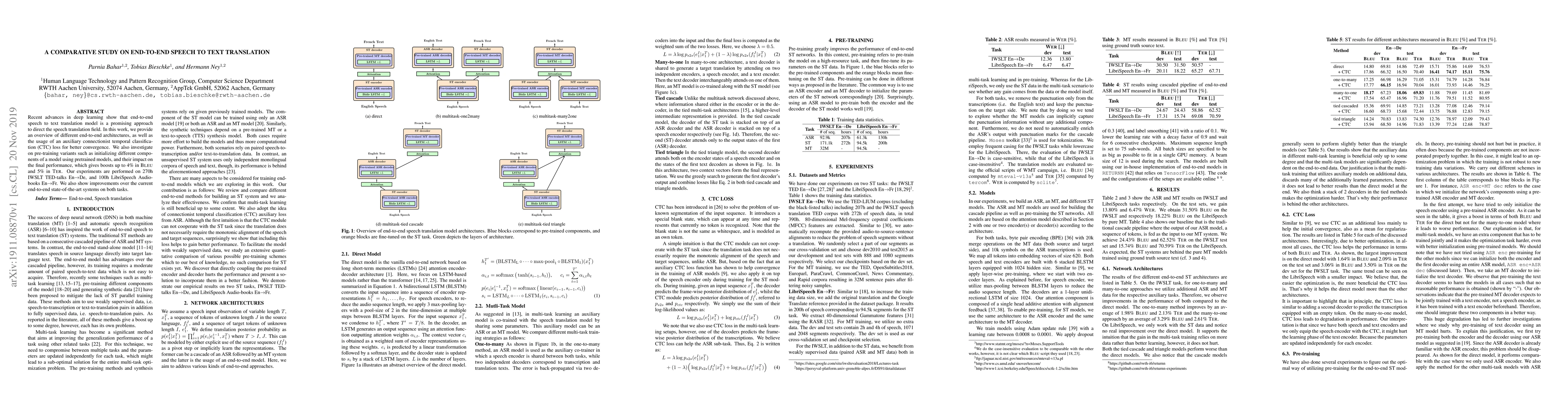 This paper reviews various end-to-end speech-to-text translation architectures and explores the use of CTC loss for improved convergence. Pre-training methods show significant performance boosts, achieving up to 4% better BLEU and 5% lower TER scores, outperforming current state-of-the-art systems on IWSLT and LibriSpeech datasets.