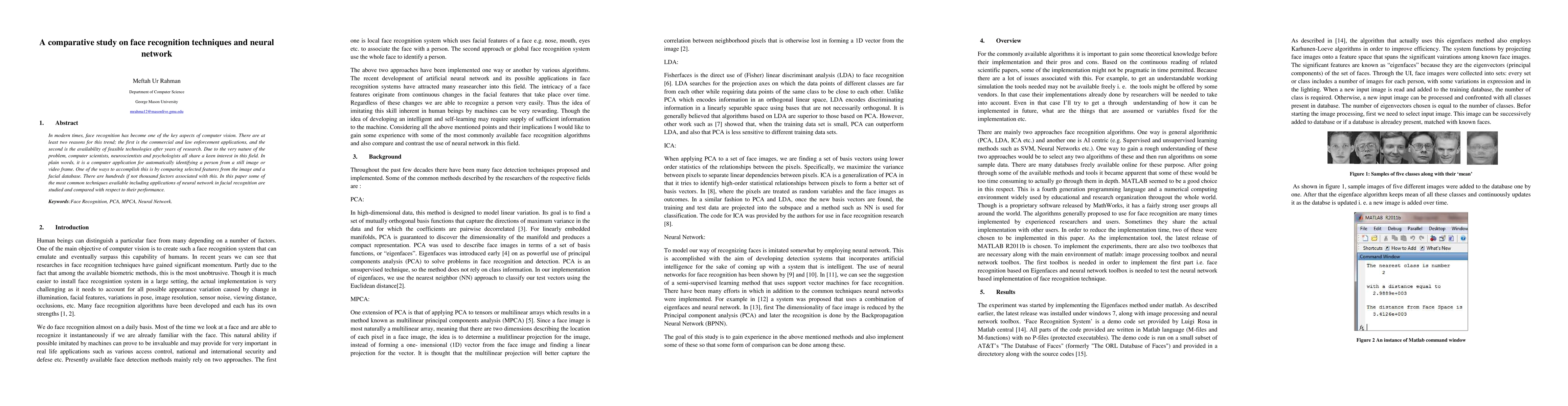 In modern times, face recognition has become one of the key aspects of computer vision. There are at least two reasons for this trend; the first is the commercial and law enforcement applications, and the second is the availability of feasible technologies after years of research. Due to the very nature of the problem, computer scientists, neuro-scientists and psychologists all share a keen interest in this field. In plain words, it is a computer application for automatically identifying a person from a still image or video frame. One of the ways to accomplish this is by comparing selected features from the image and a facial database. There are hundreds if not thousand factors associated with this. In this paper some of the most common techniques available including applications of neural network in facial recognition are studied and compared with respect to their performance.