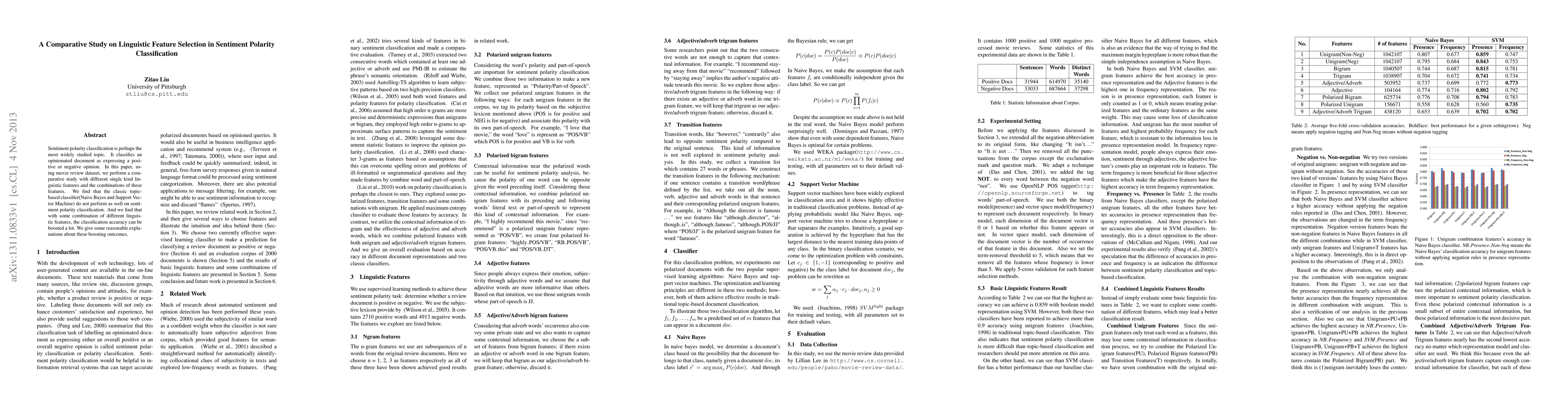 This paper compares the effectiveness of various single and combined linguistic features for sentiment polarity classification using a movie review dataset. It finds that traditional classifiers like Naive Bayes and SVM underperform, but combining different linguistic features significantly boosts classification accuracy.