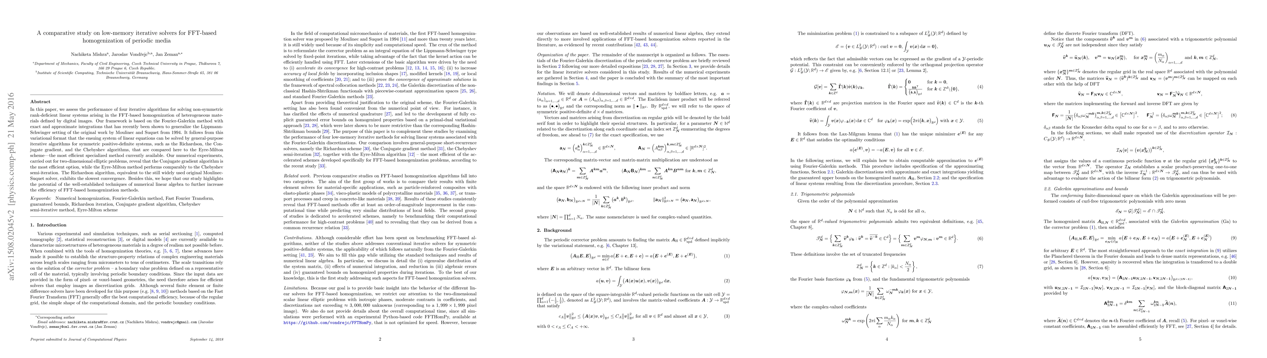 This paper compares four iterative solvers—Richardson, Conjugate gradient, Chebyshev, and Eyre-Milton—to solve non-symmetric rank-deficient linear systems in FFT-based homogenization of heterogeneous materials. The Conjugate gradient method proved most efficient, while the Eyre-Milton scheme performed comparably to Chebyshev, and the Richardson method showed the slowest convergence.