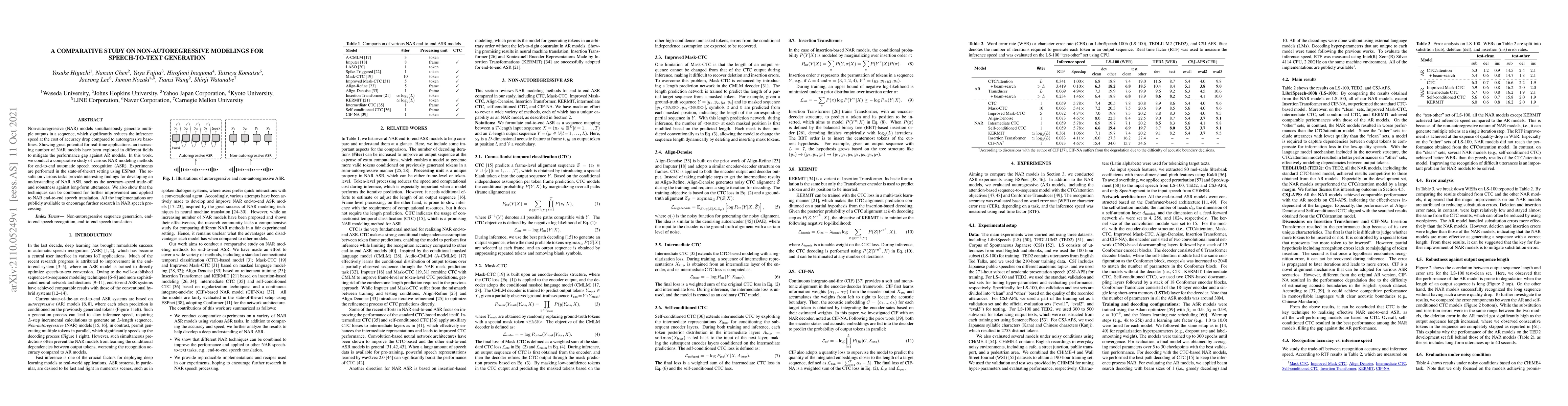 Non-autoregressive (NAR) models simultaneously generate multiple outputs in a sequence, which significantly reduces the inference speed at the cost of accuracy drop compared to autoregressive baselines. Showing great potential for real-time applications, an increasing number of NAR models have been explored in different fields to mitigate the performance gap against AR models. In this work, we conduct a comparative study of various NAR modeling methods for end-to-end automatic speech recognition (ASR). Experiments are performed in the state-of-the-art setting using ESPnet. The results on various tasks provide interesting findings for developing an understanding of NAR ASR, such as the accuracy-speed trade-off and robustness against long-form utterances. We also show that the techniques can be combined for further improvement and applied to NAR end-to-end speech translation. All the implementations are publicly available to encourage further research in NAR speech processing.
